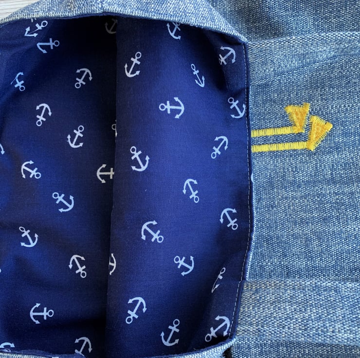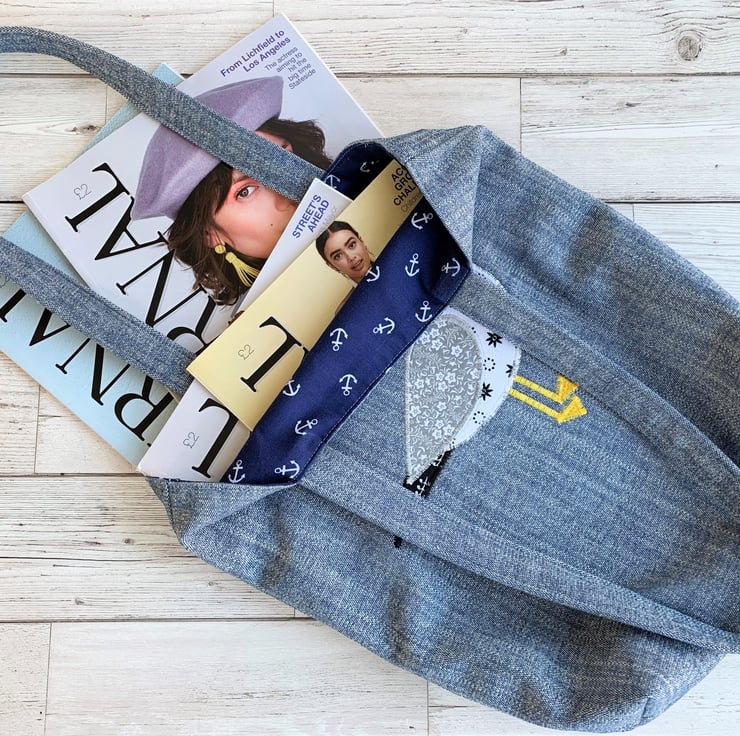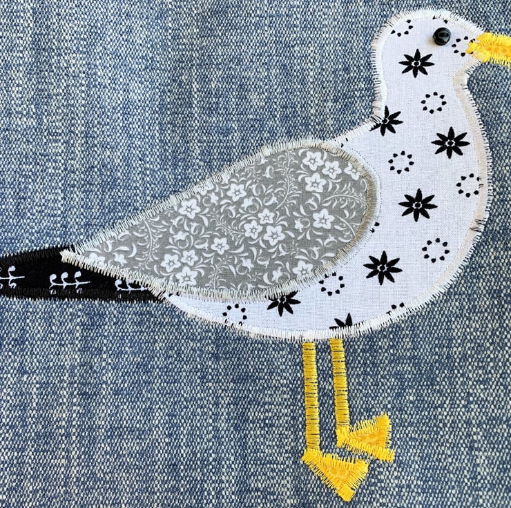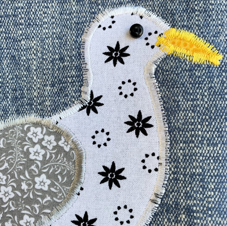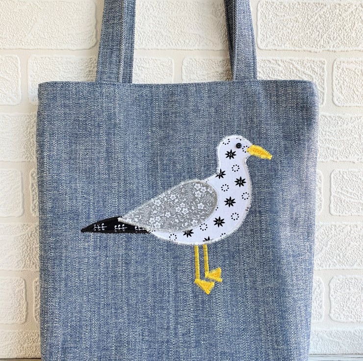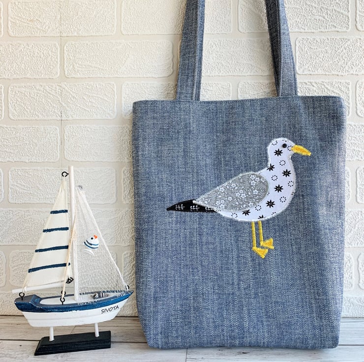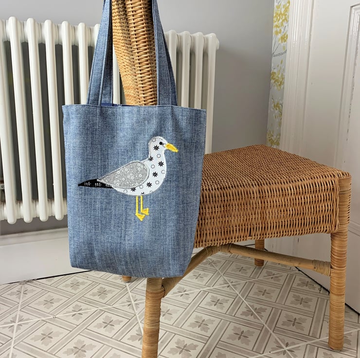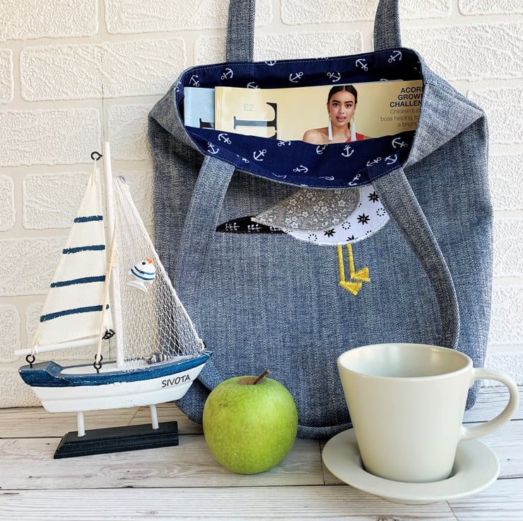 A seagull tote bag in a lovely blue fabric with a floral appliqué seagull. The blue fabric has a paler fleck running through the weave. The seagull is made from white fabric with pattern of small black flower motifs. It has a grey wing with a white ditsy floral pattern, and its tail feather is black with small white patterns. The beak and feet are a golden yellow fabric with a tiny darker dots. I've machine-stitched the seagull's legs in golden yellow satin stitch and given him a small black button eye. The bag is fully lined with navy blue fabric with a nautical pattern of white anchors.