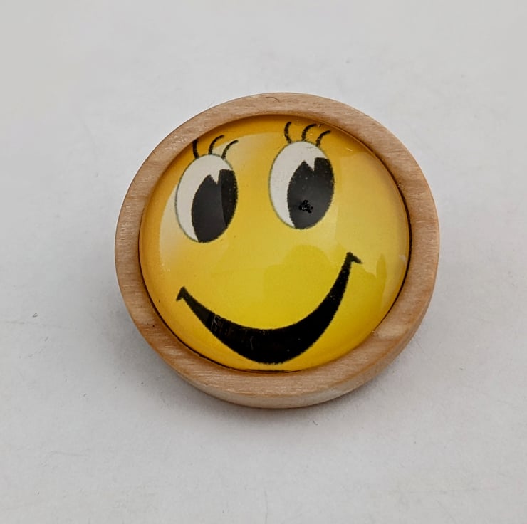 25mm emoji glass cabochon in a wooden brooch setting. In an organza gift bag.