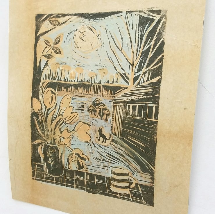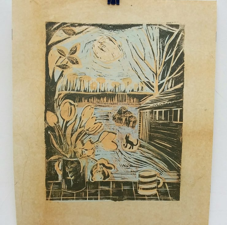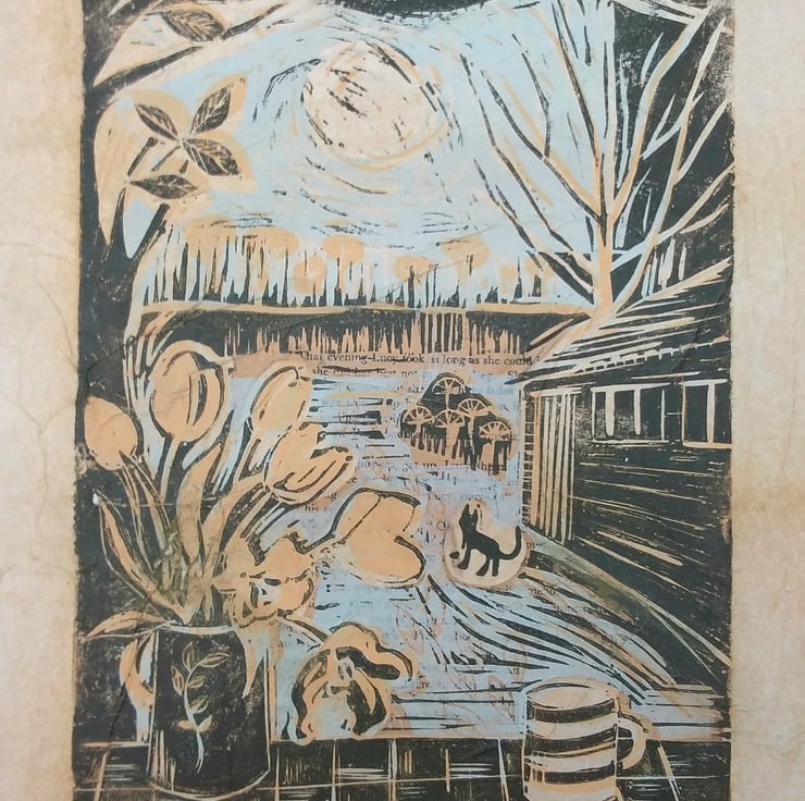 A mixed media piece using original lino printed artwork layered together as a collage - 'Winter Sun and tulips'.
