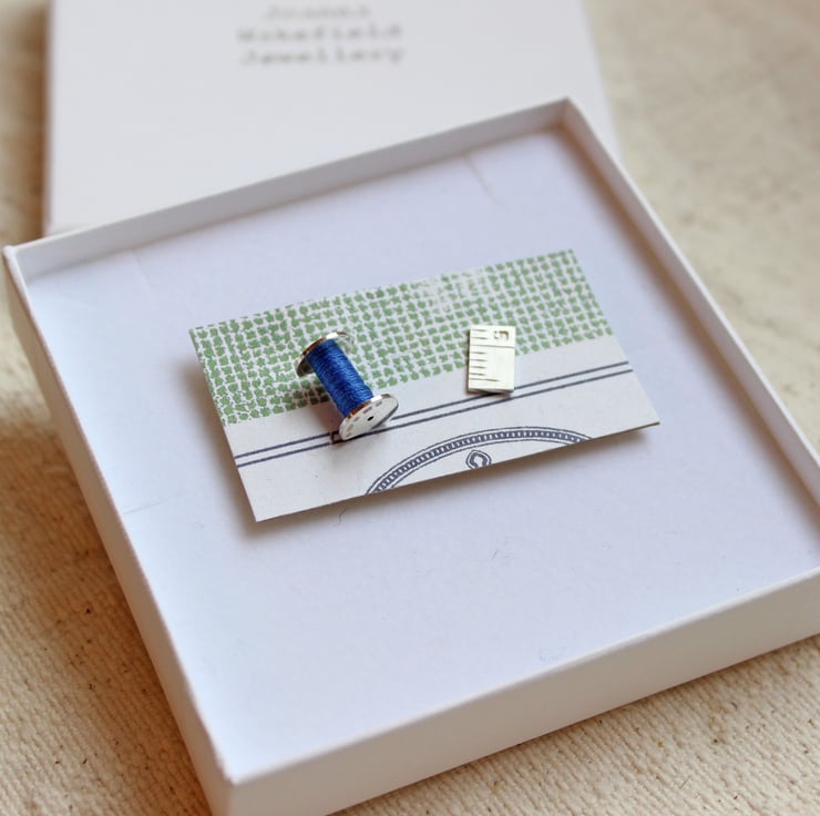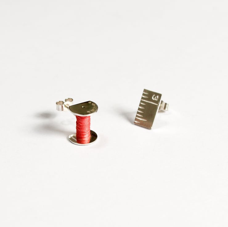 These earrings are both hallmarked at the Sheffield Assay Office. The bobbins markings particularly pretty, uniquely hallmarked in a curve to reflect labelling on vintage cotton reels.