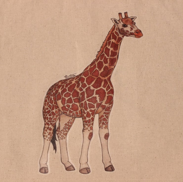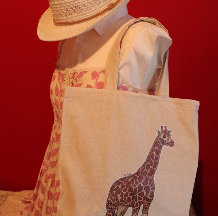 Featuring my very own Rothschild Giraffe drawing, this fabric tote bag measures roughly 38cm x 40cm making it a great size for carrying your stuff such as food shopping, craft supplies, books, and more, all while showing off your love for giraffes.