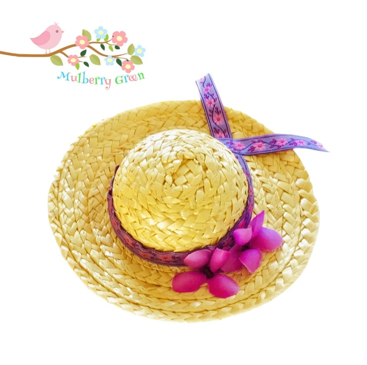 A pretty straw hat to fit the Mulberry Green dolls. The hat is decorated with woven purple braid and a two pretty Spring flowers.
