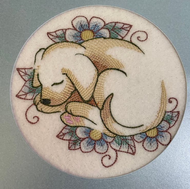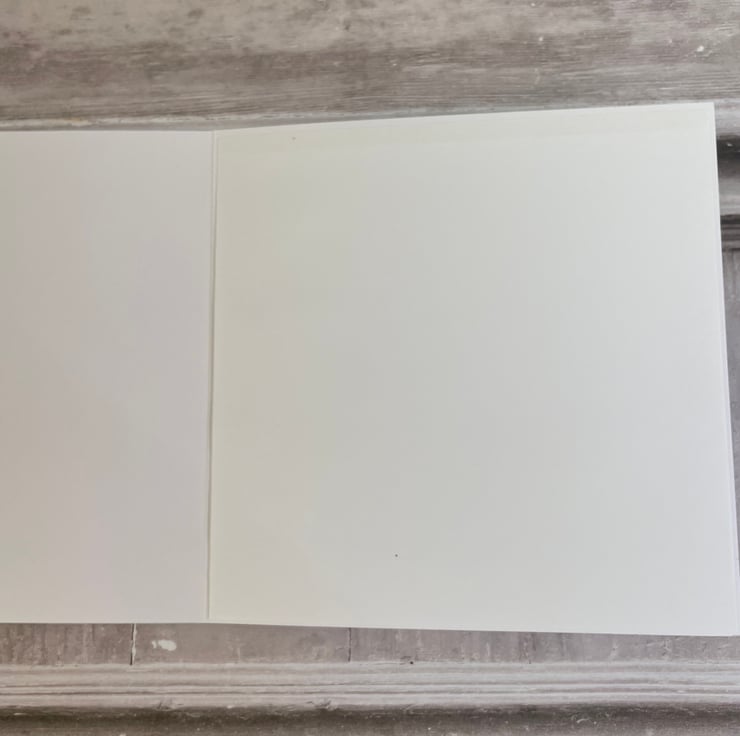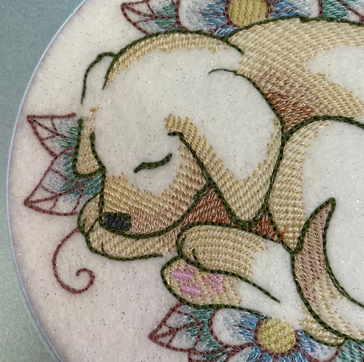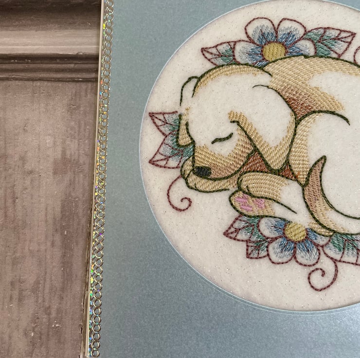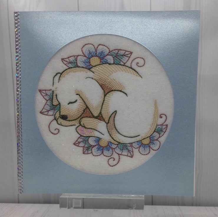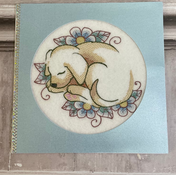 Stitched onto white felt with a hint of sparkle. This is a painterly design, very delicate. White card stock and envelope with a pearl blue frame.