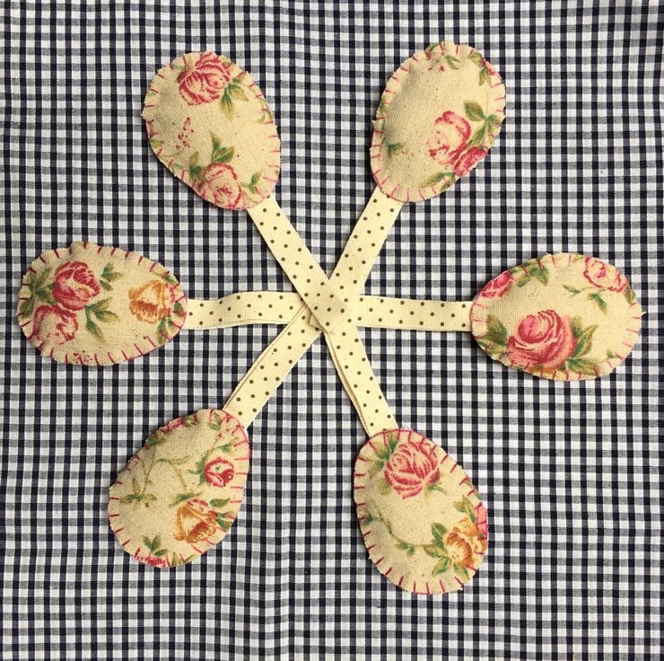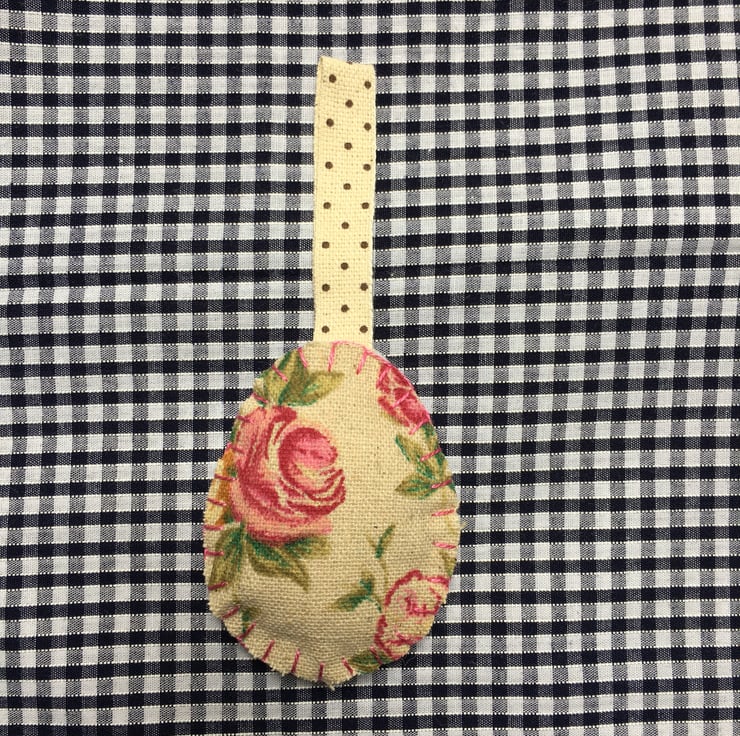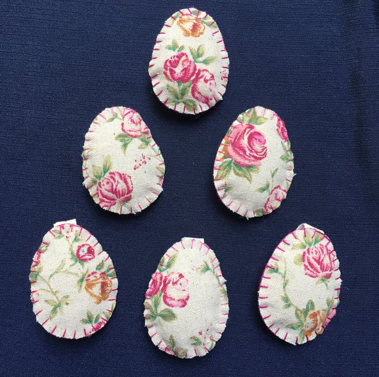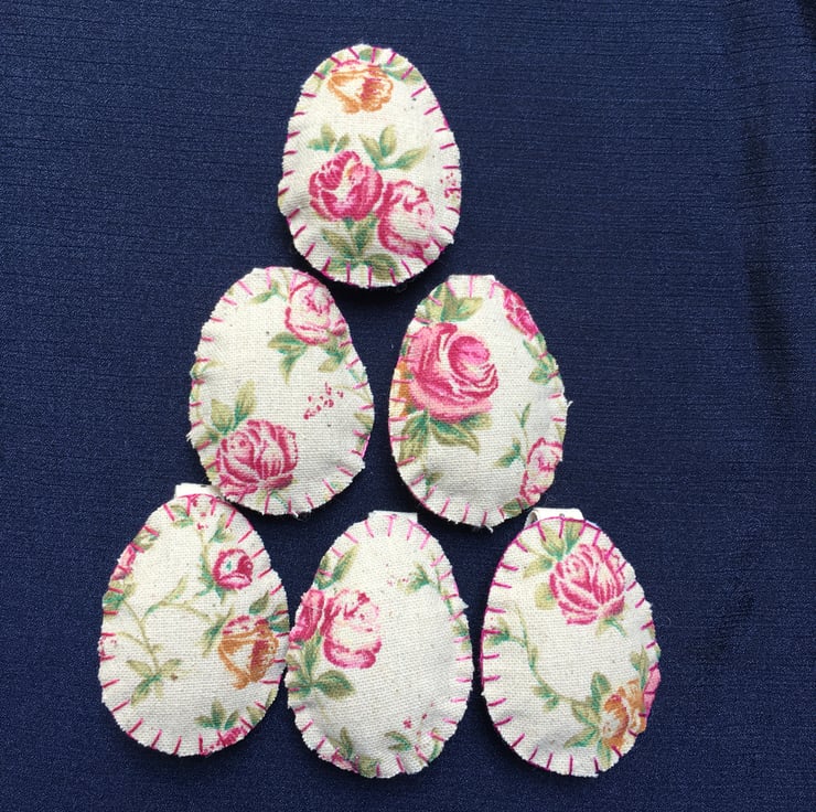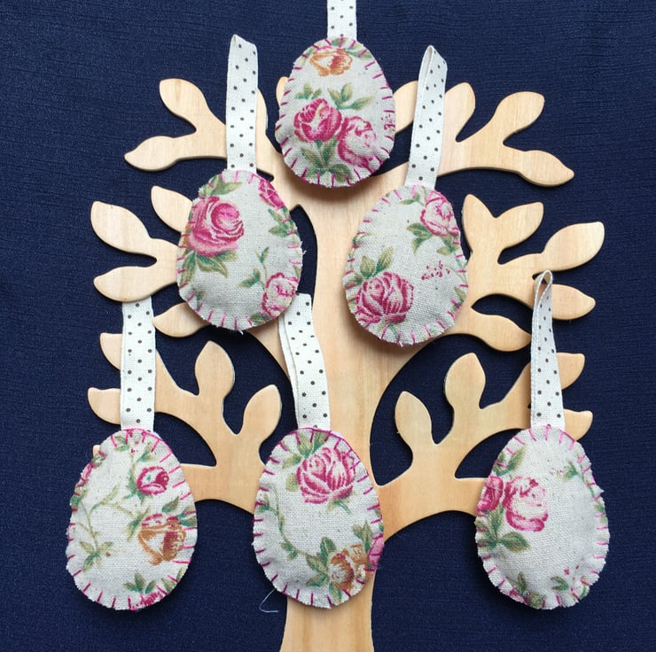 The eggs were created by bonding floral fabric to a wool blend felt before hand embroidering them. They have been stuffed with filling compliant to British Standards and finished with a pretty ribbon. The back is plain white felt