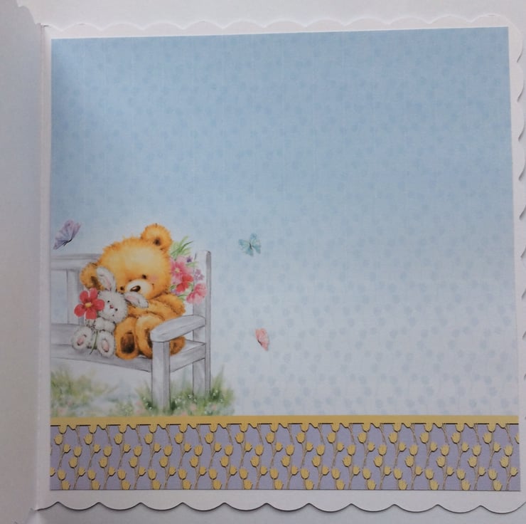 This is a lovely luxury 3D handmade greeting card to give to someone for any occasion. The design is a really cute teddy bear and bunny rabbit having a cuddle on a bench. They are both holding flowers just for you. The bunny's ears and feet are glittered, as well as the butterfly hovering nearby.
