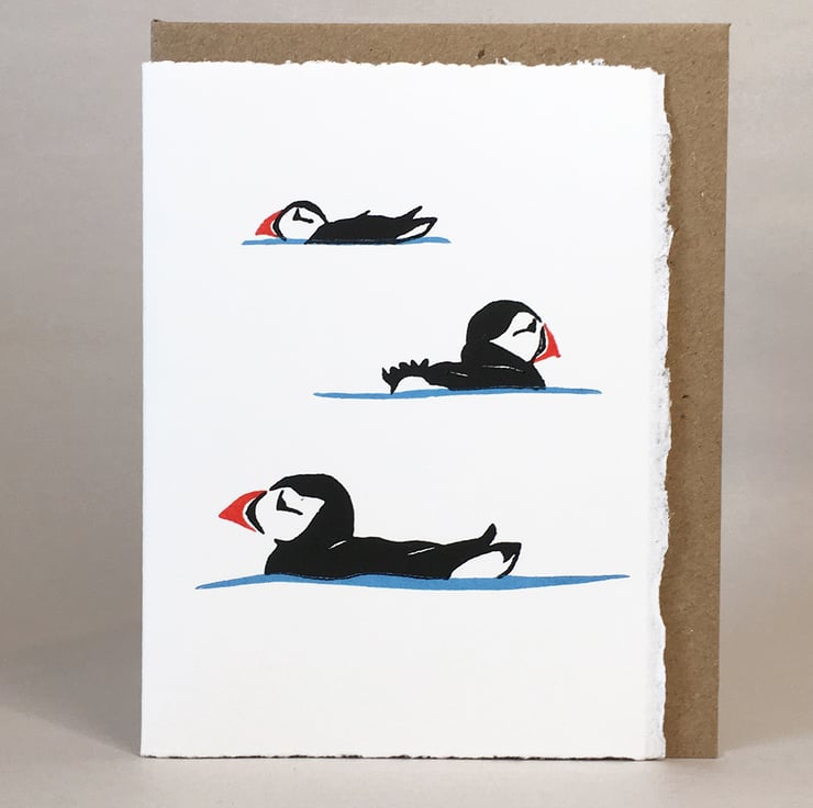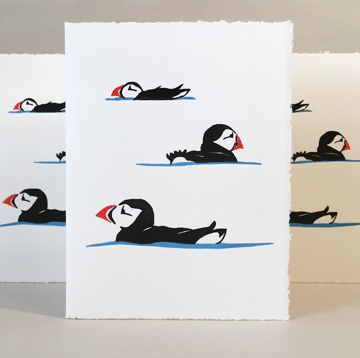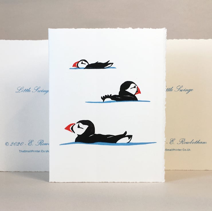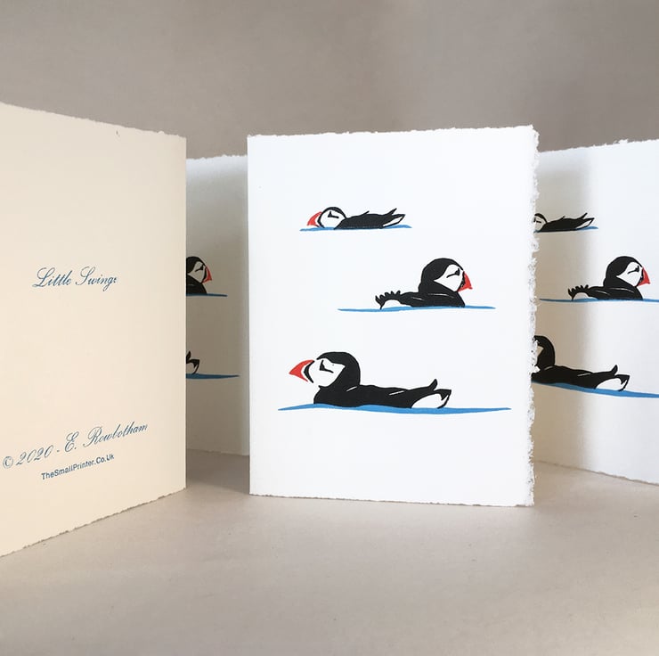 This is an original LinoCut Card handprinted on beautiful artist paper in three colours, with info on the back hand-set in old letterpress, hand inked & printed on my ancient Press.