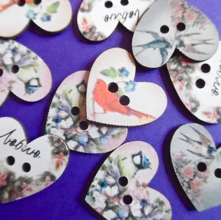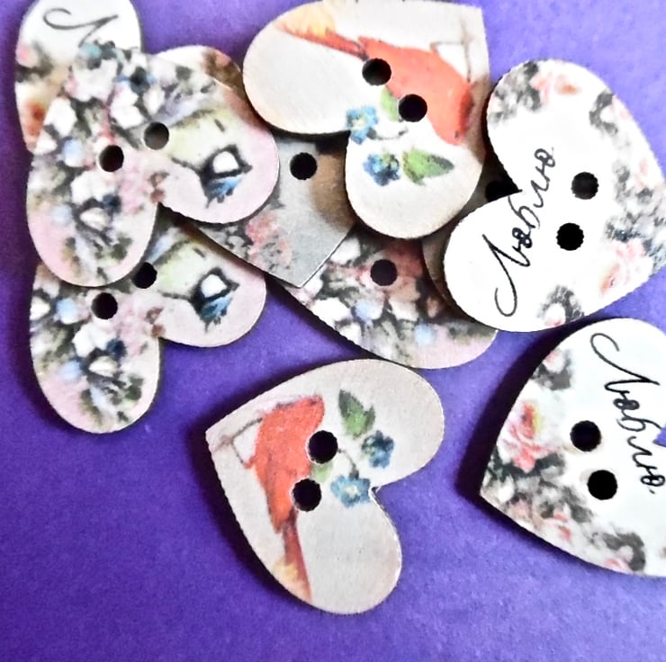 10 x Heart Shape Wood Bird and Flower Design Buttons 2 holes