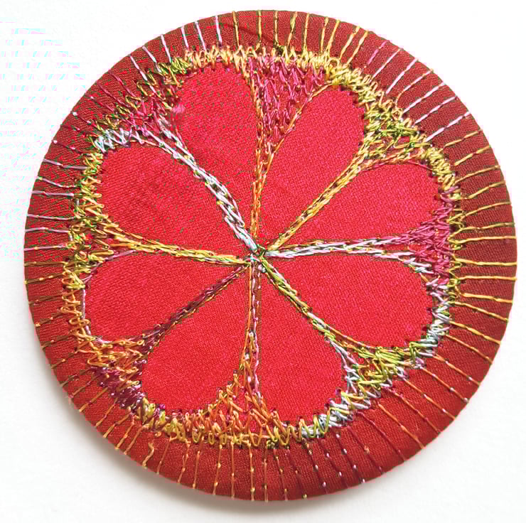 Made from layers of fabric including hand dyed Egyptian cotton and silk fabrics using the free machine embroidery style of sewing