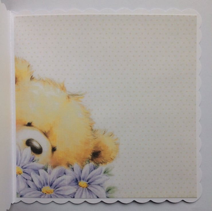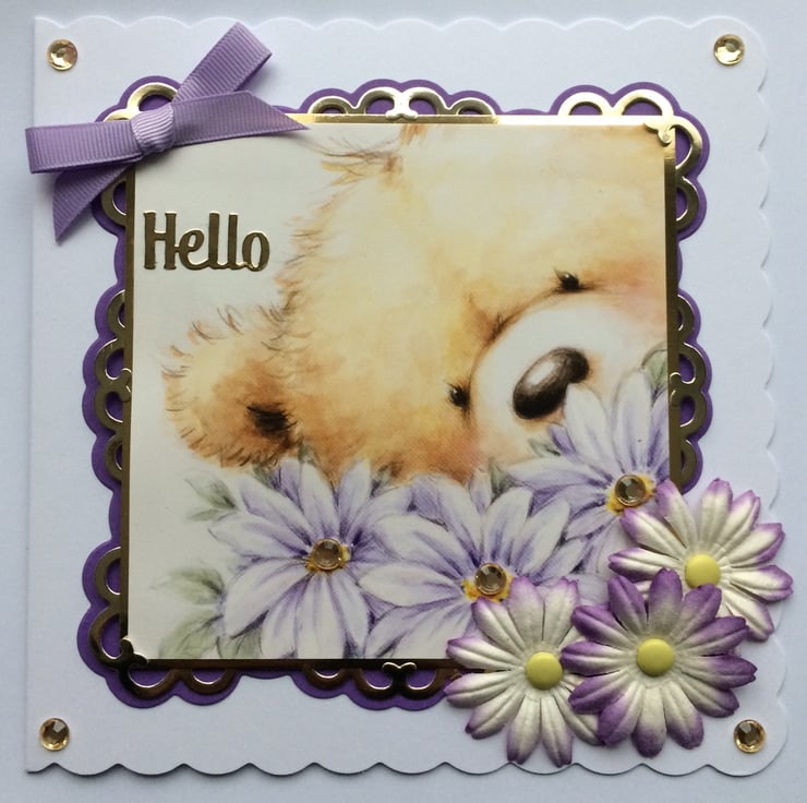 This is a lovely luxury 3D handmade greeting card. The design is a really cute teddy bear peeking out from behind some huge purple flowers. The card has been finished with gems, 3D flowers, and a matching purple bow.