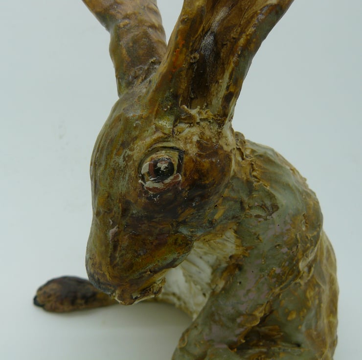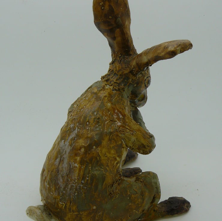 Pinched pot hare made from clay. Fired in bisque kiln until 1000 degrees & then glazed with stoneware glazes & fired to 1230 degrees. Approx 16 x 18 x 10 cms.