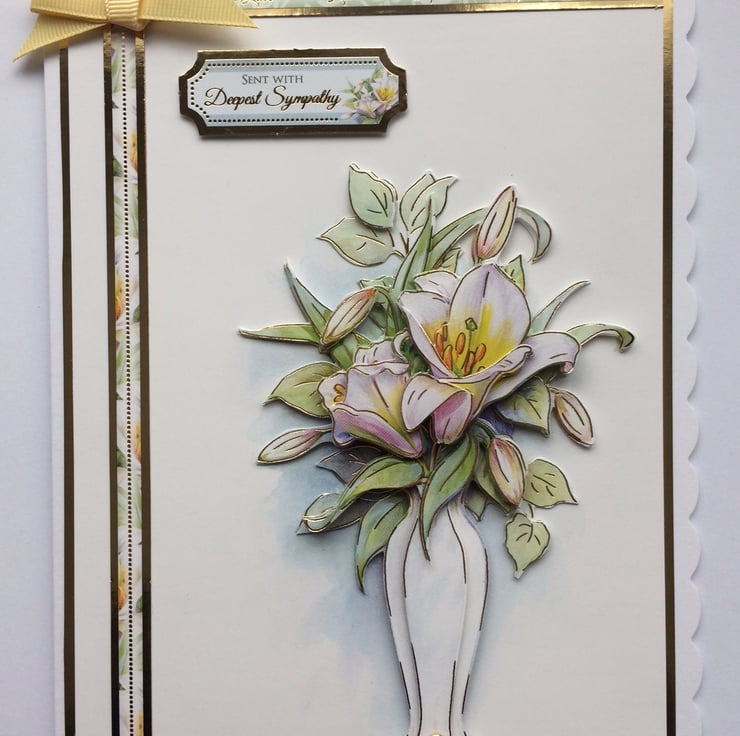 This is a beautiful luxury 3D handmade greeting card. The design is a 3D layered white vase of lilies that are gold foiled. The 3D greeting has been gold foiled and says "Sent With Deepest Sympathy". The card has been finished with gold gems and a matching yellow ribbon bow.