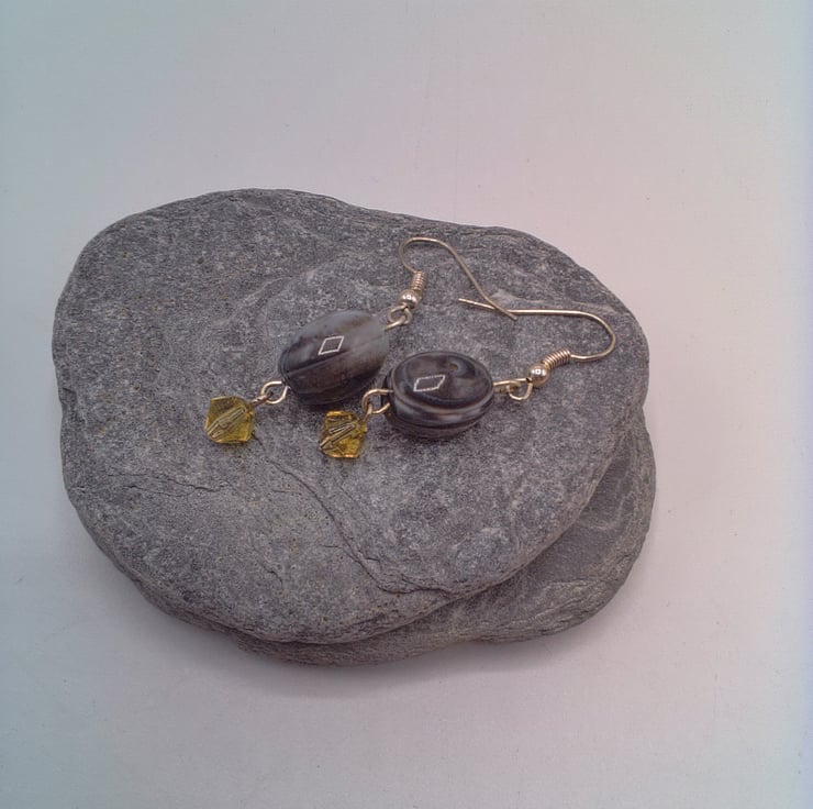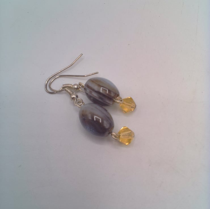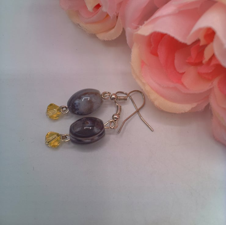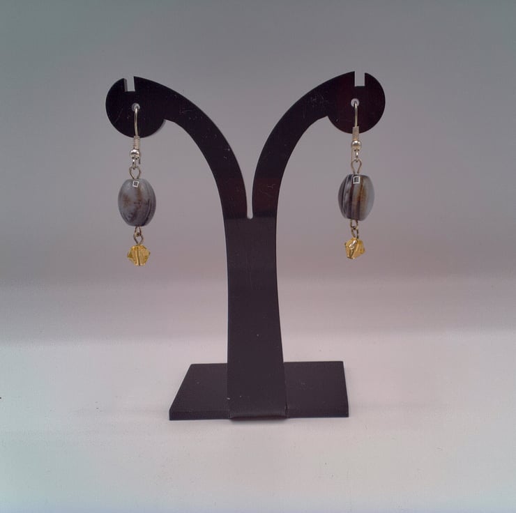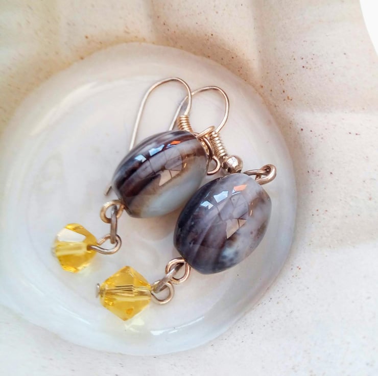 These earrings match well with any outfit you wear everyday for work or a day out or for a casual evening out. They would make the perfect gift for a friend or relative for a birthday or anniversary, or a treat for yourself. They are made using 15 mm x 10 mm grey puffed oval agate beads, with a 6 mm yellow crystal bicone bead. They are suspended on silver plated ear wires and they have a drop of 3 cm from the base of the ear wire. The earrings will be dispatched wrapped in tissue paper in an organza bag and delivered to you via Royal Mail first class post.