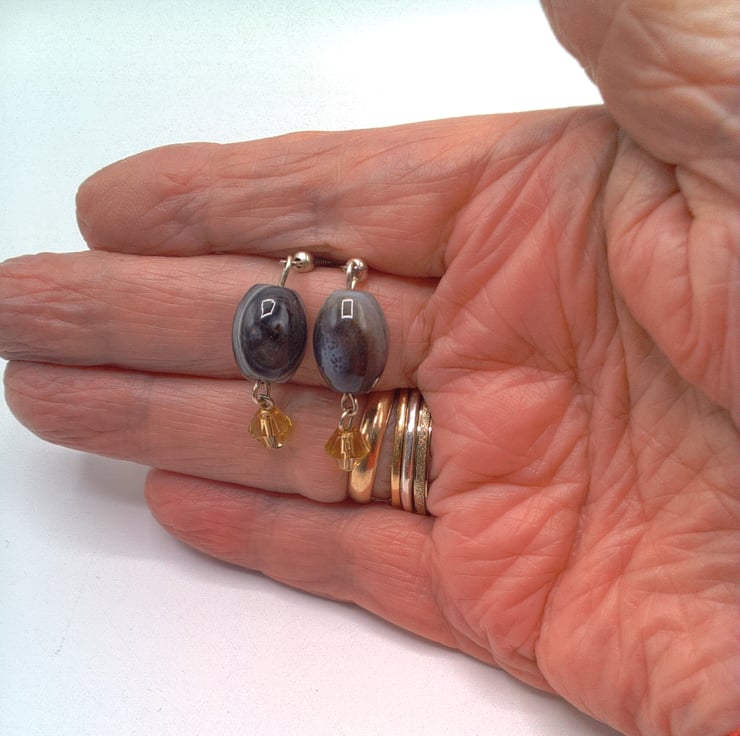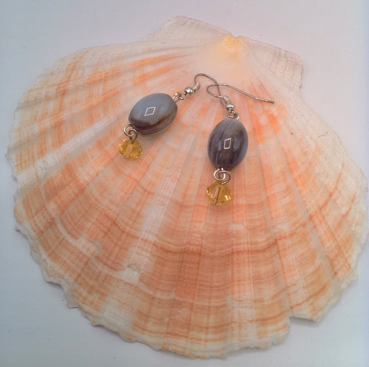 These earrings match well with any outfit you wear everyday for work or a day out or for a casual evening out. They would make the perfect gift for a friend or relative for a birthday or anniversary, or a treat for yourself. They are made using 15 mm x 10 mm grey puffed oval agate beads, with a 6 mm yellow crystal bicone bead. They are suspended on silver plated ear wires and they have a drop of 3 cm from the base of the ear wire. The earrings will be dispatched wrapped in tissue paper in an organza bag and delivered to you via Royal Mail first class post.