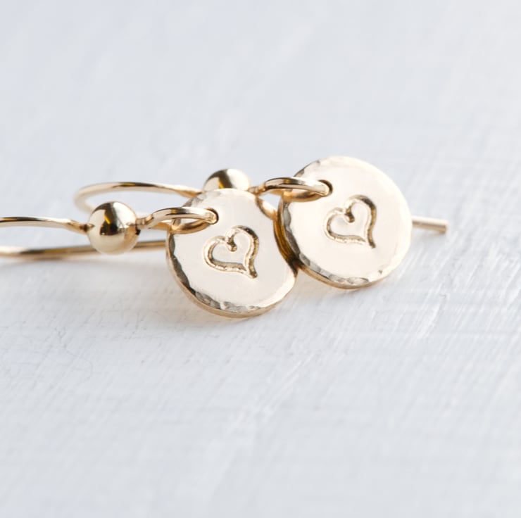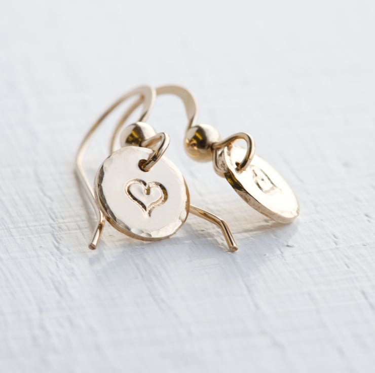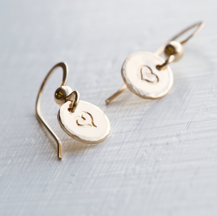 Handmade Gold Small Disc Dangling Earrings are made with 20 Gauge (0.8mm) 14K Gold Filled sheet and Ear Hooks. The size of disc is approximately 8 mm diameter and the total length is approximately 20mm. The listed earrings are slightly textured on edge of the circle, and a small heart has been hand stamped on each earring.