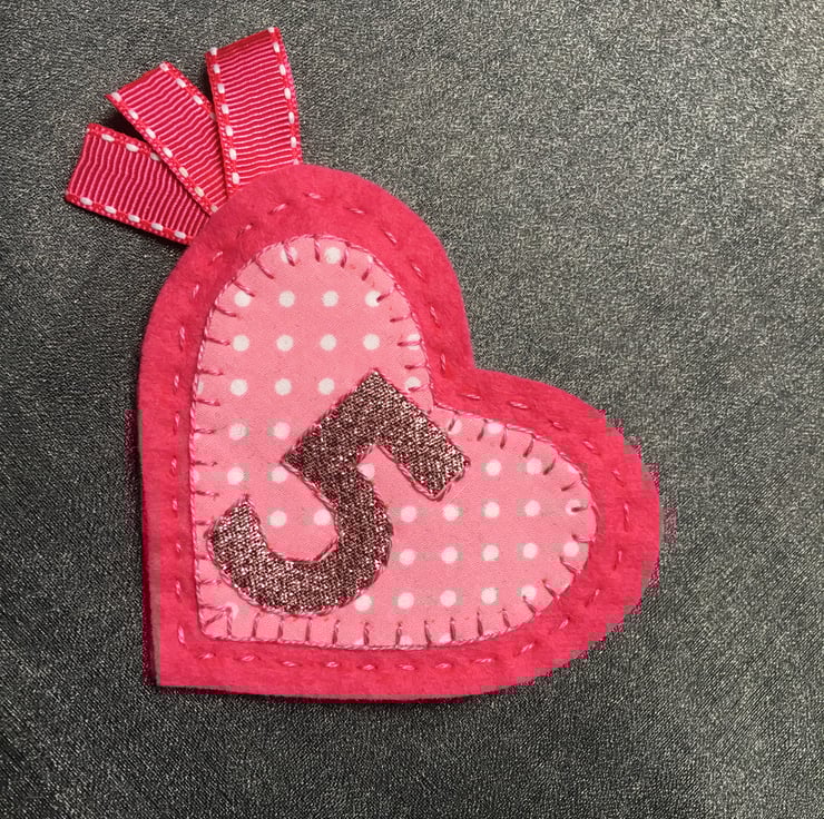 The heart is made from a wool blend felt, fabric, ribbon and a sparkly number. It is hand embroidered.