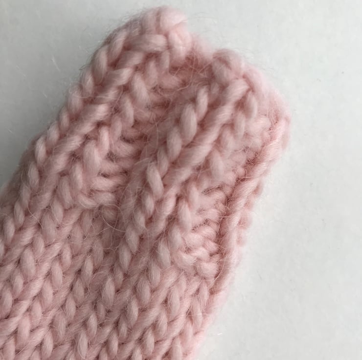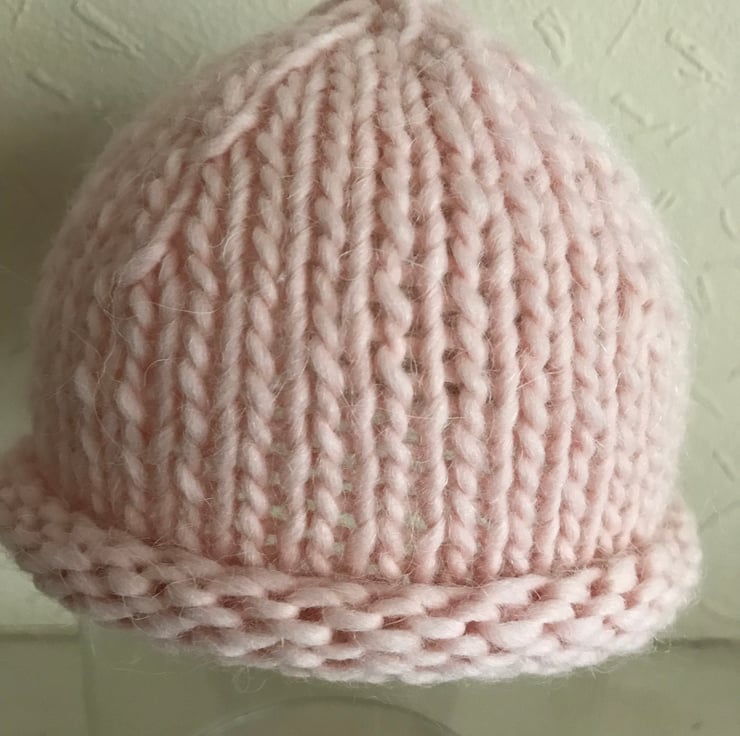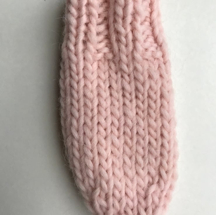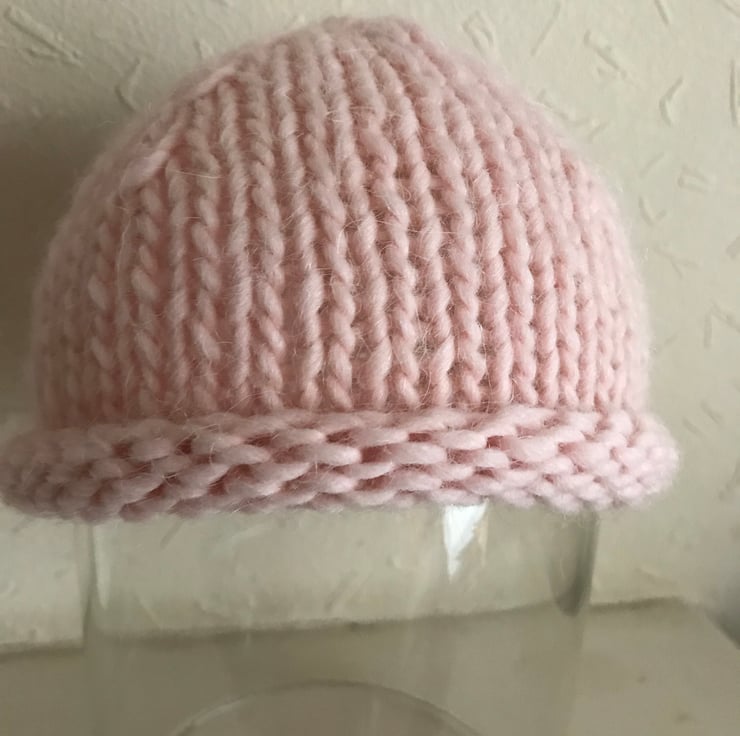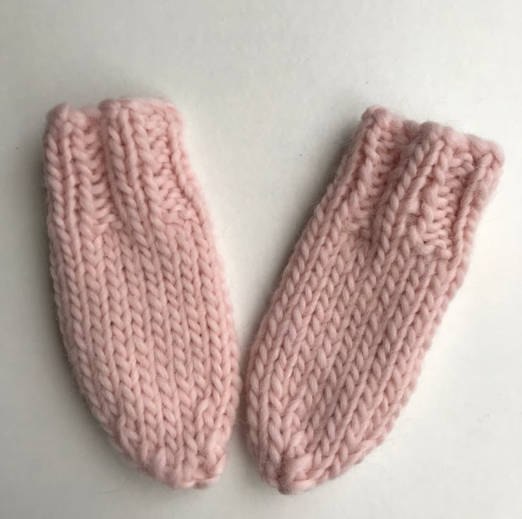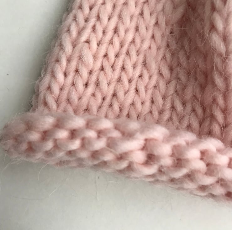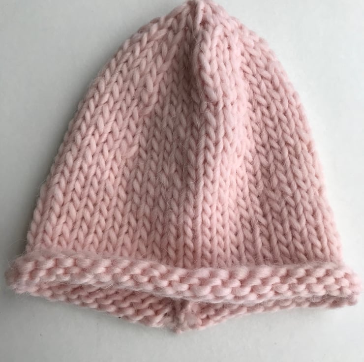 This hat and mitten set are hand knitted in a luxury chunky merino wool and alpaca yarn. They are both worked in stocking stitch. The hat has a rolled brim and the mittens have a ribbed cuff.