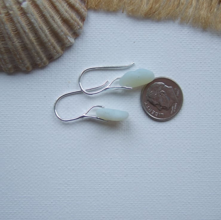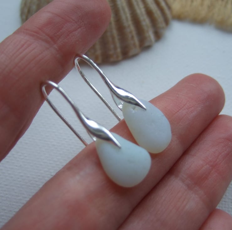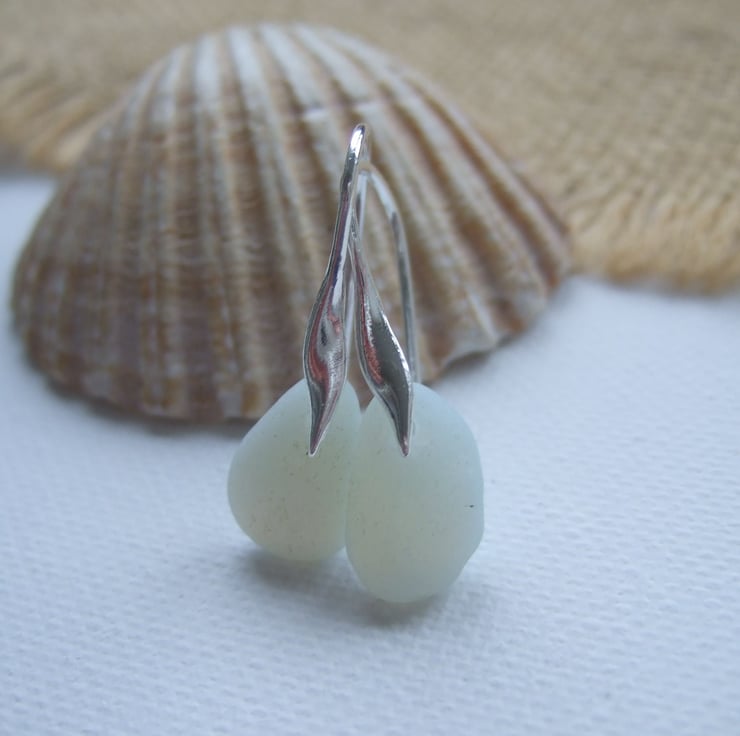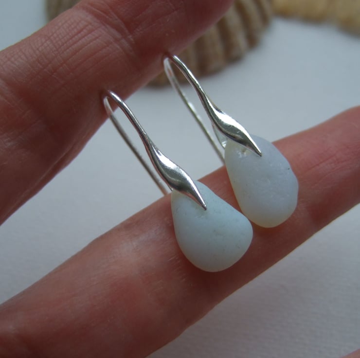 Wave design earrings with Opalescent sea glass from Seaham. Opalescent sea glass has s subtle blue shimmer with a yellow hint - the colour of the sea glass changes with the light! It is best visible when wet or ever so slightly oiled with unscented baby oil. The sea glass is sheer and will let light through, which makes the earrings glow. These earrings are more opaque.
