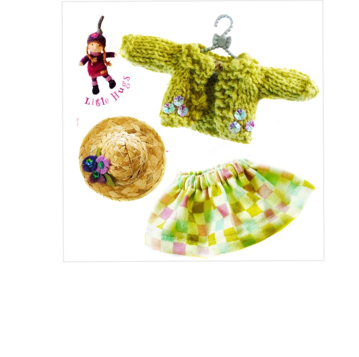 A pretty little chartreuse cardigan made especially to fit the Little Hugs dolls. The cardigan is hand knitted with Jamieson’s pure Shetland wool. It is decorated with flower cupped sequins and comes on a cute little hanger.
