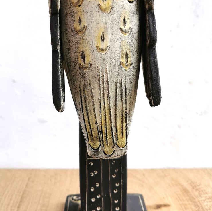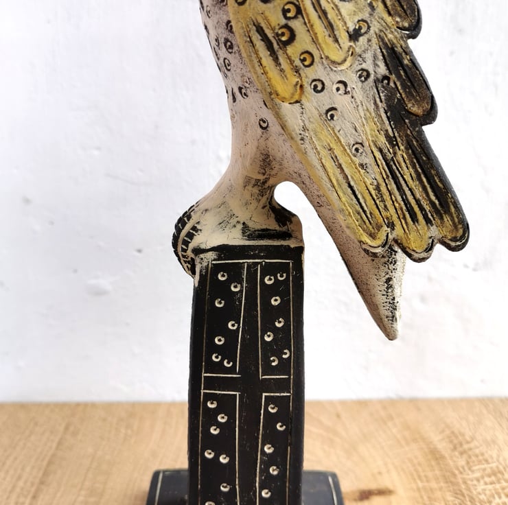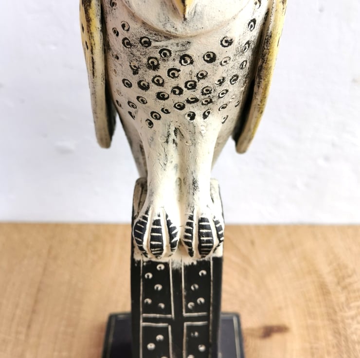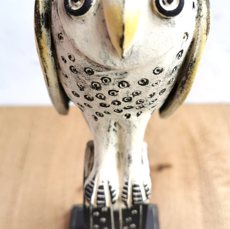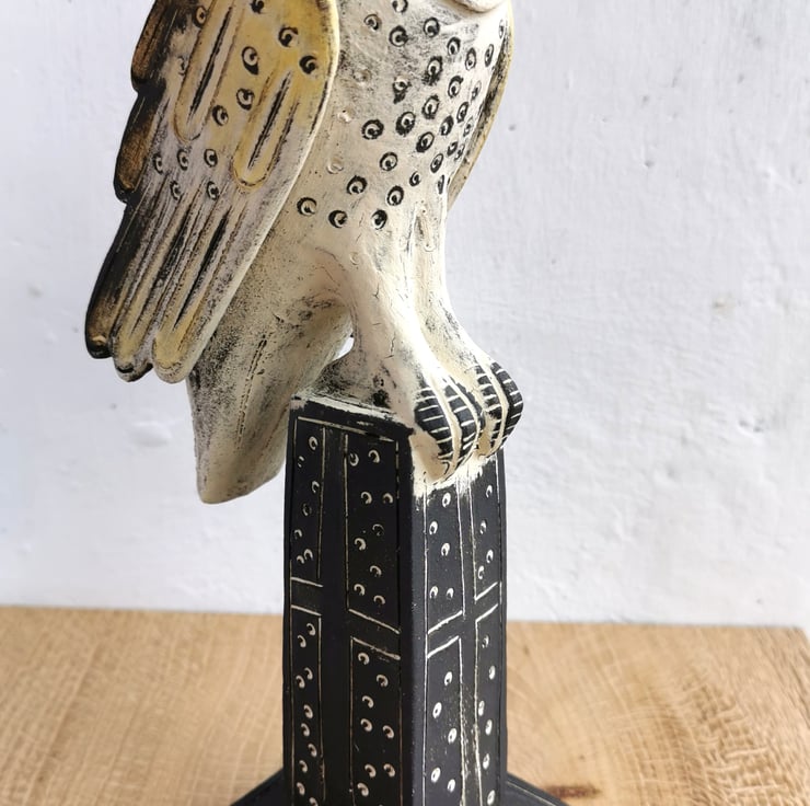 A handmade ceramic sculpture of a Barn Owl, poised and ready to fly from his perch. Looking to the stars.