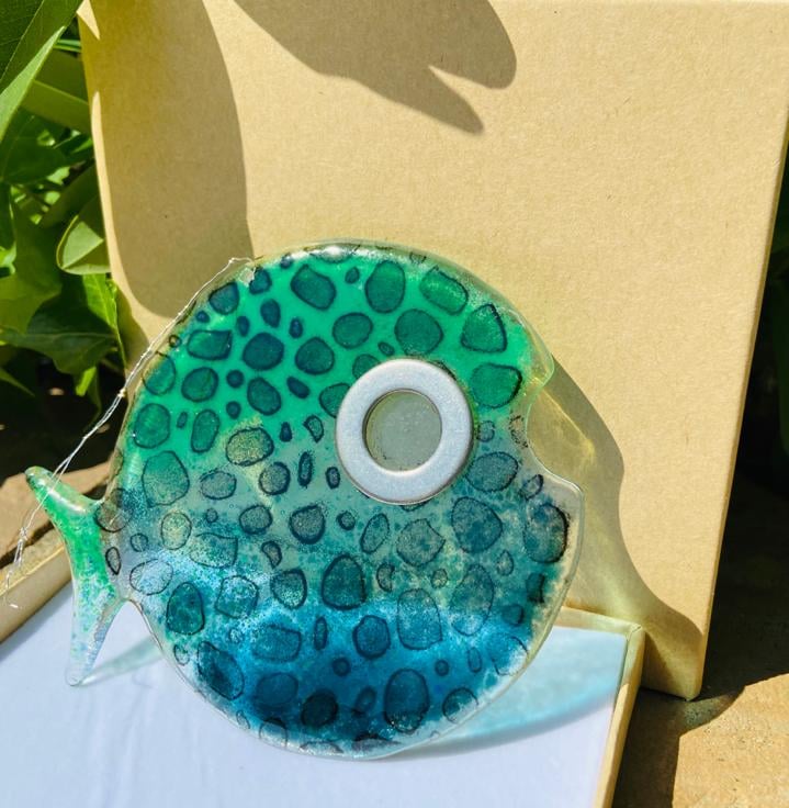 The body is hand cut and made from 2 pieces of glass fused together. After the glass is cleaned, the top layer is hand sifted over the two pieces of glass with different coloured glass grains to give the graduated coloured effect. The fish is then carefully placed on a kiln shelf and fired. After the kiln has cooled the fish is drilled to enable hanging and the silver coloured ring is added for the eye.