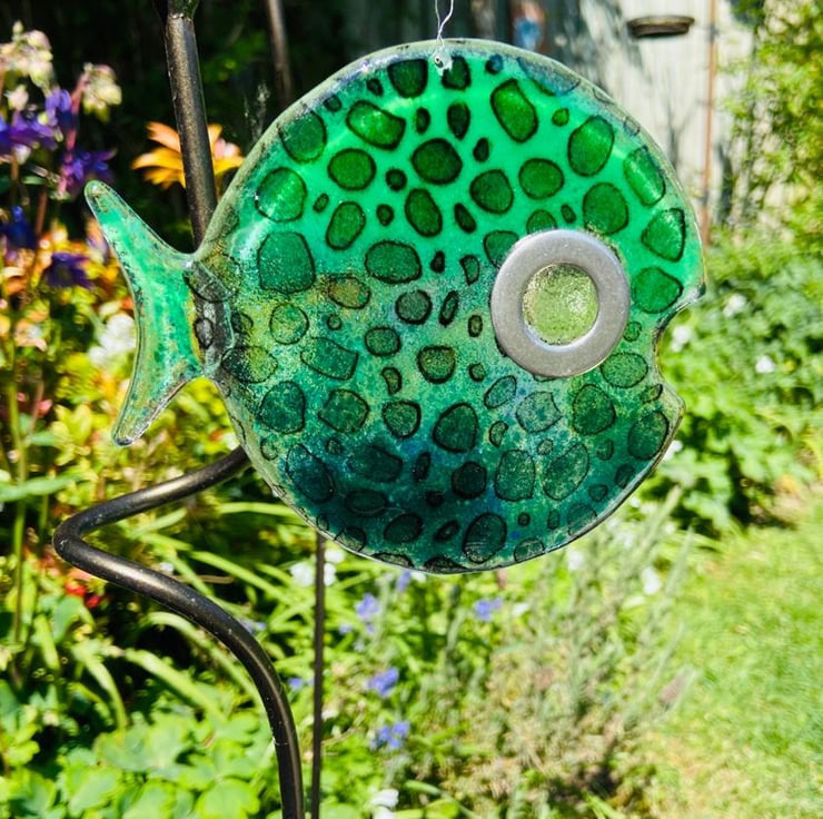 A beautiful fused glass big eyed fish to hang in the window, in the garden or against a wall, in fact anywhere inside or outside the home!
