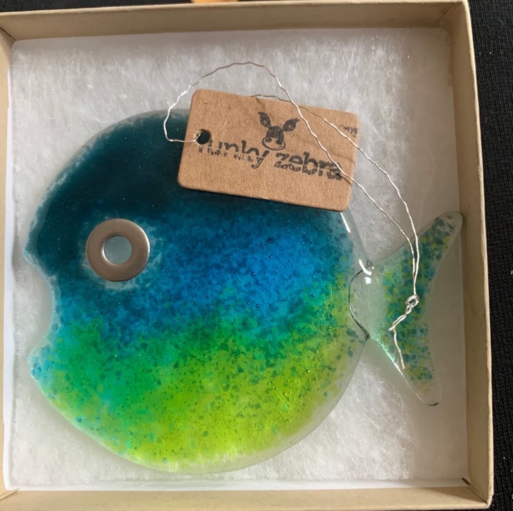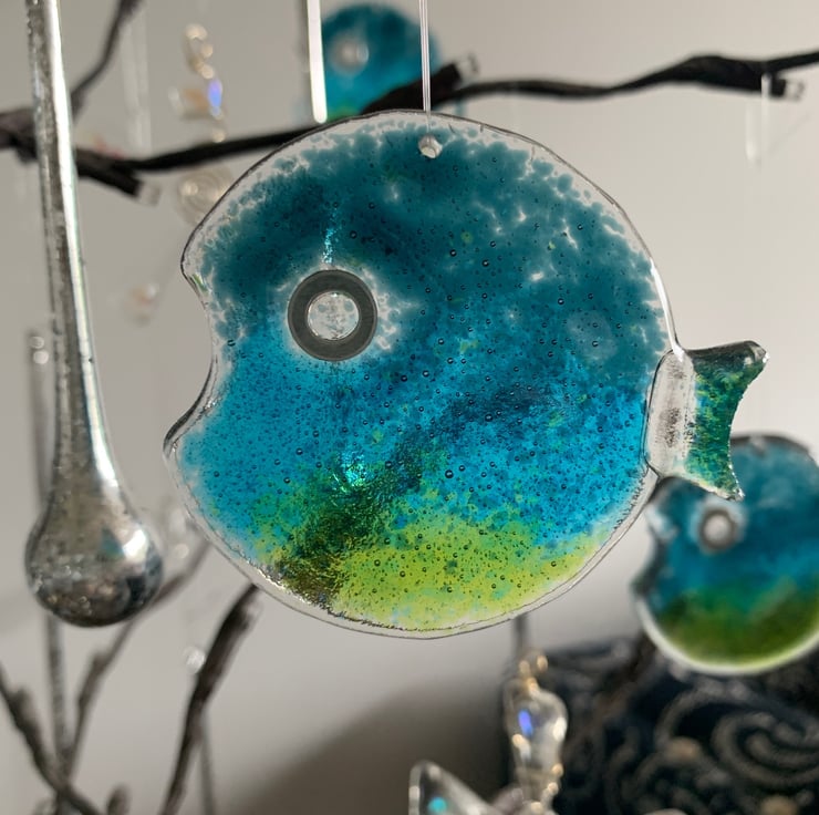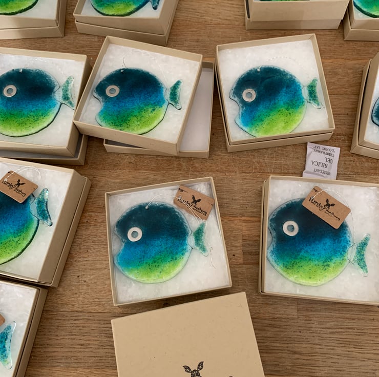 The body is hand cut and made from 2 pieces of glass fused together. After the glass is cleaned, the top layer is hand sifted over the two pieces of glass with different coloured glass grains to give the graduated coloured effect. The fish is then carefully placed on a kiln shelf and fired. After the kiln has cooled the fish is drilled to enable hanging and the silver coloured ring is added for the eye.