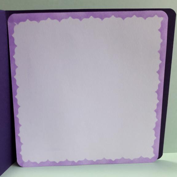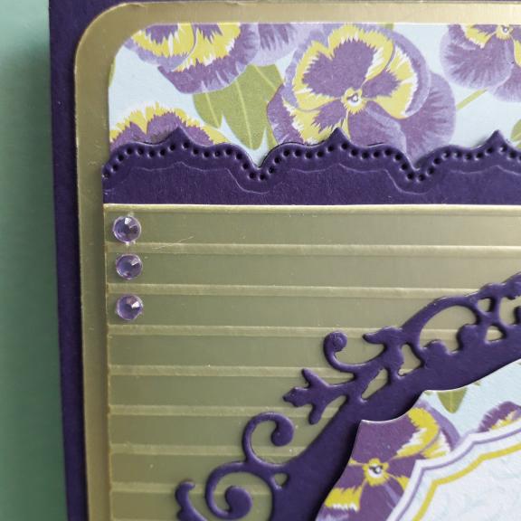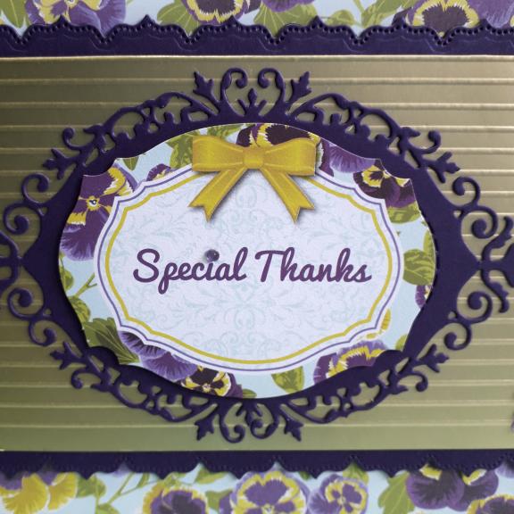 A "Special Thanks" Card which is 15cm/6" square. The pansy framed oval shaped topper has been placed on a fancy purple frame then gold corrugated card which has purple die cut trims at the top and bottom, then pansy patterned paper, gold card and finally a purple base card.