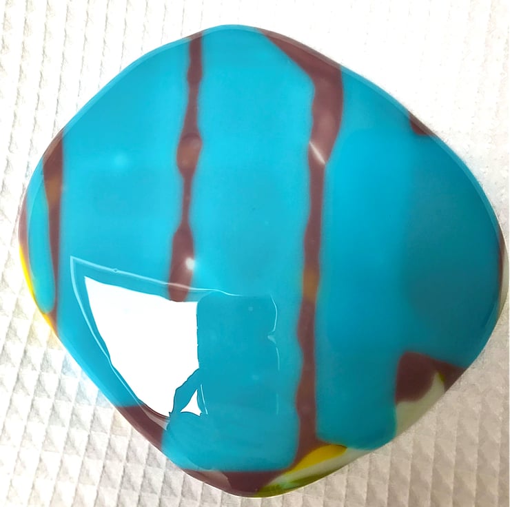 This was one of my most fun projects since I started making glass. You're able to see the process from the photos listed. I stacked random colours of glass and fused to one slab, and then once cooled I got a hammer and smashed it to pieces! Sooooo much fun! Then I stood the pieces on their sides in the kiln and fired it up again until they melted down into these glass puddles, some of which I have turned into pendants.