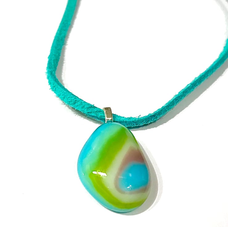 A unique handmade pendant with a swirl of coloured Bullseye glass hung on a 17" faux suede cord with a silver plated clasp and fixings. The pendant measures a max of 25mm tall and 18mm wide. This pendant has been through two individual firings in my kiln, to a temperature of 800 degrees Celsius, both times included an annealing process during the cool down to avoid thermal shock.