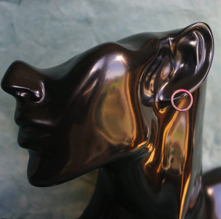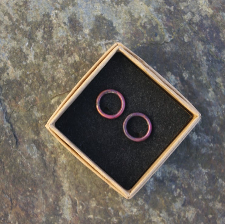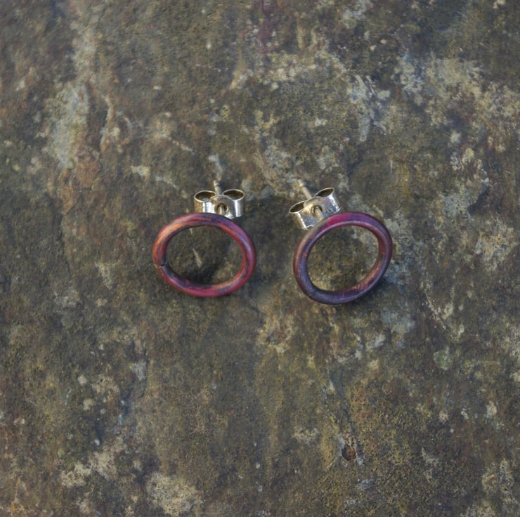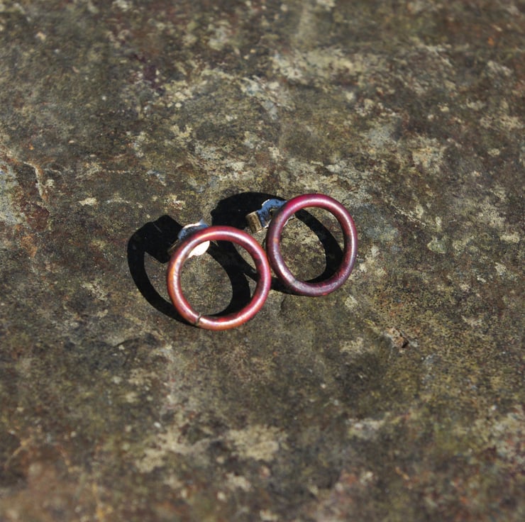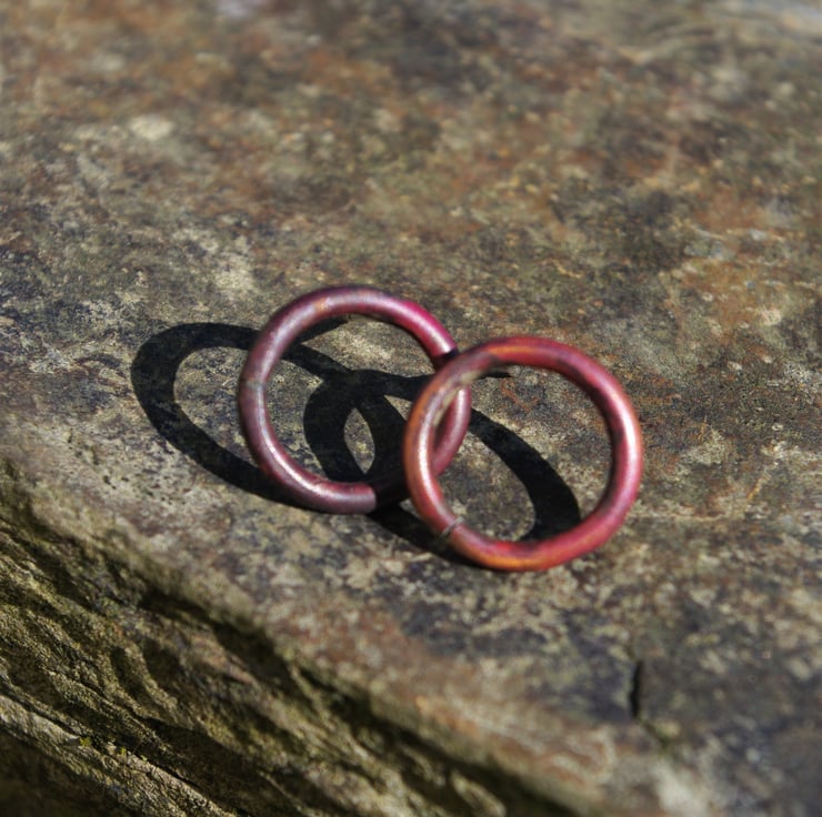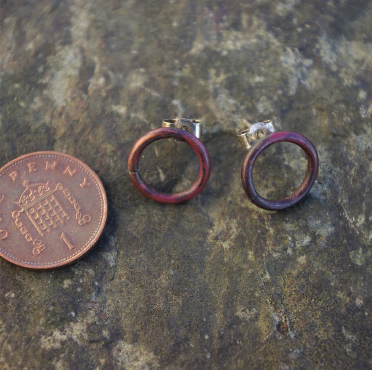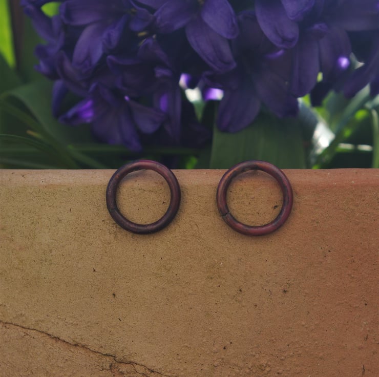 I have made circular copper hoop earrings with an outside diameter of 13mm/ half an inch . The copper has taken on deep copper tones as a result of heat and preserved with a penetrating wax .