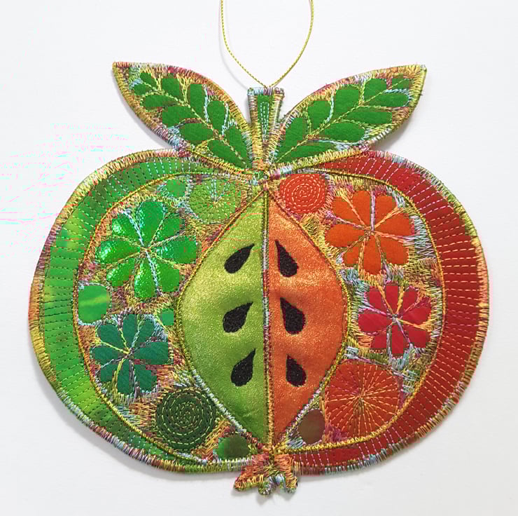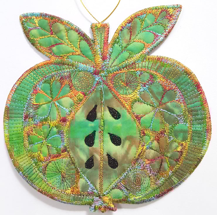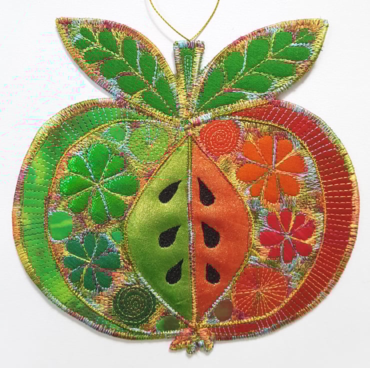 Made from layers of fabric including hand dyed Egyptian cotton and silk fabrics using the free machine embroidery style of sewing
