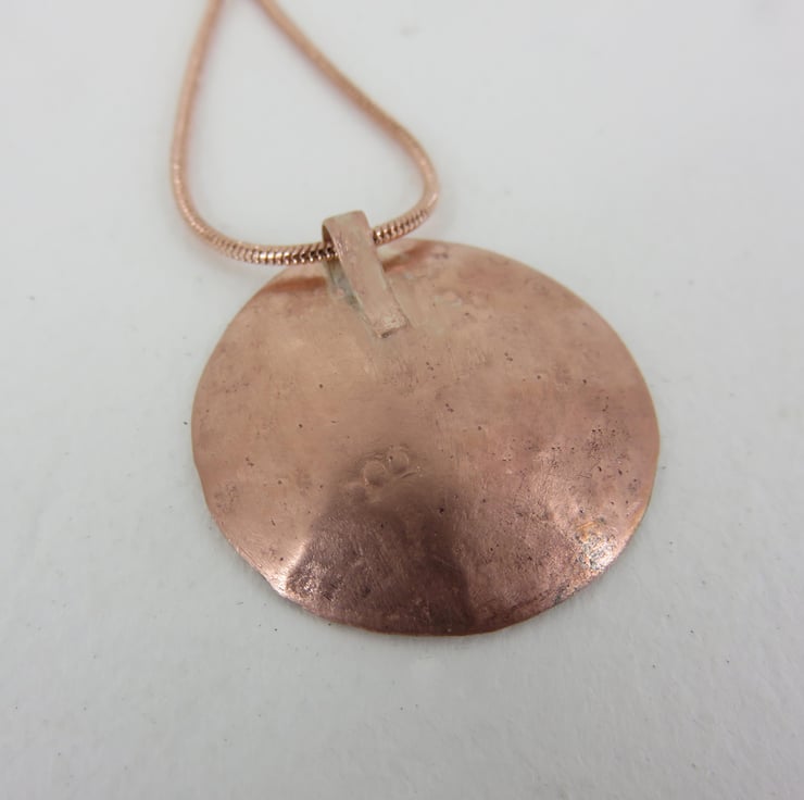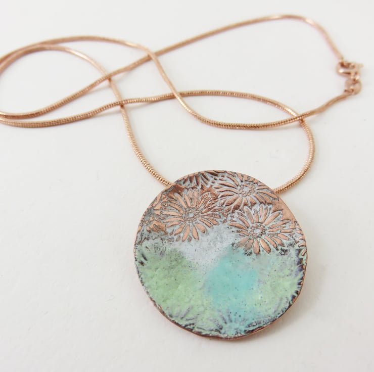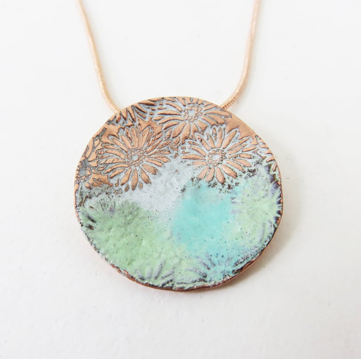 A 30mm copper circle has been textured with a daisy pattern and soldered on the back with copper loop. The front is then enamelled in a kiln with white to pick out the daisy pattern, and then further dabs of light blue and spring green enamel added for a spring feel. It hangs on an 18inch rose gold plated chain. It is posted out in a 830degree gift box.