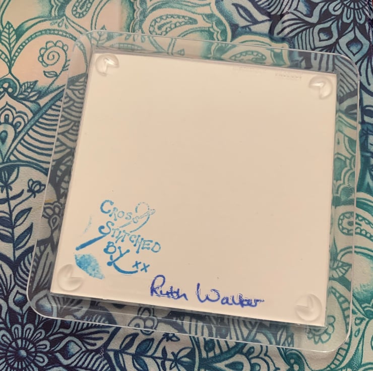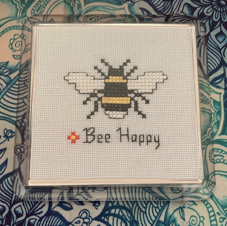 Acrylic coaster that has got a crossed stitch bee on it. The bee has been cross stitched on pale blue evenweave fabric and Bee Happy has also been crossed stitched on the material.