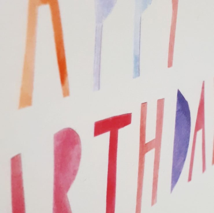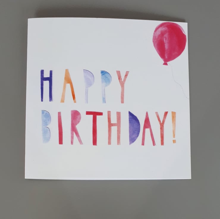 A simple colourful birthday card suitable for young and old alike! Hand cut multicoloured letters spelling out 'HAPPY BIRTHDAY' and a bright red balloon were hand cut from paper painted by me with watercolours. The design has been digitally reproduced onto eco-friendly card.