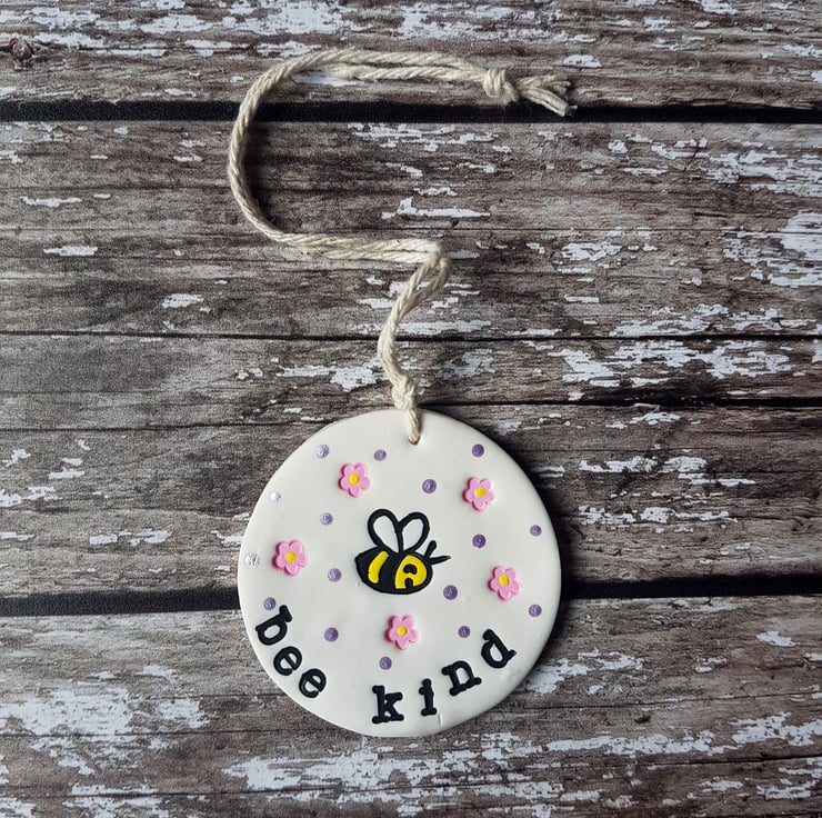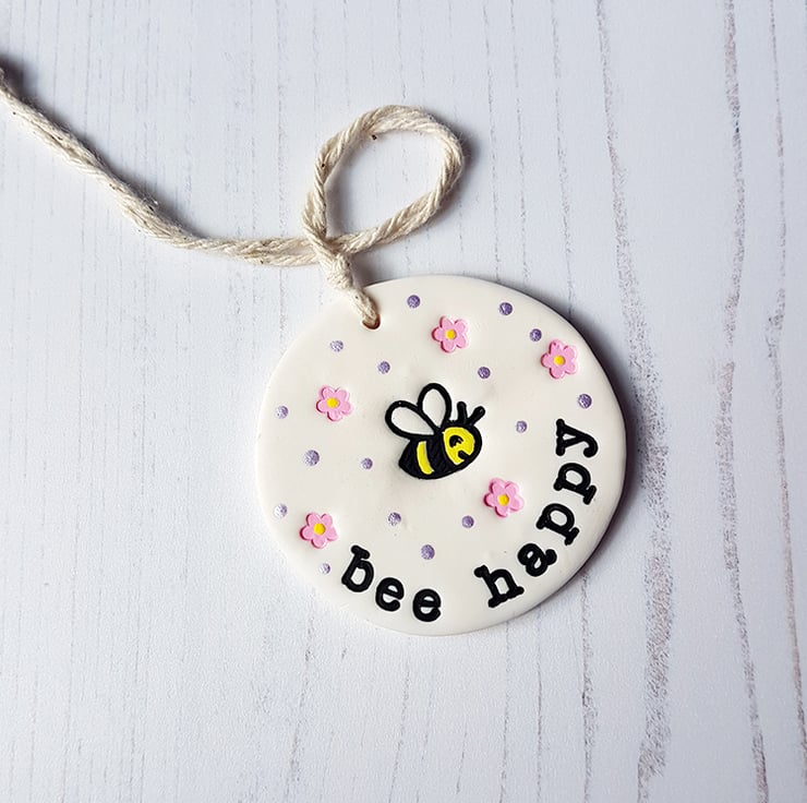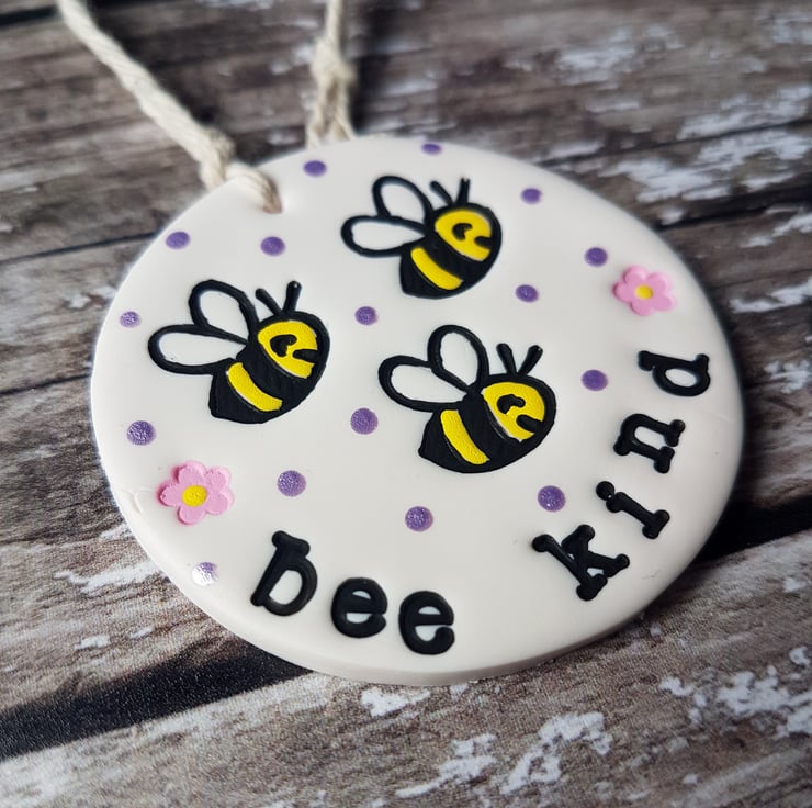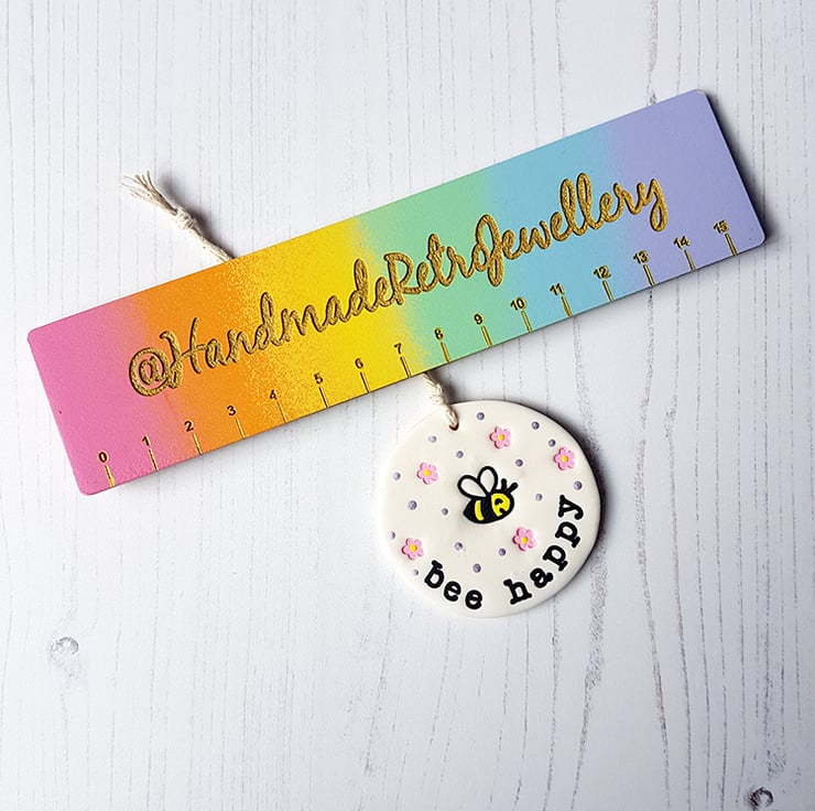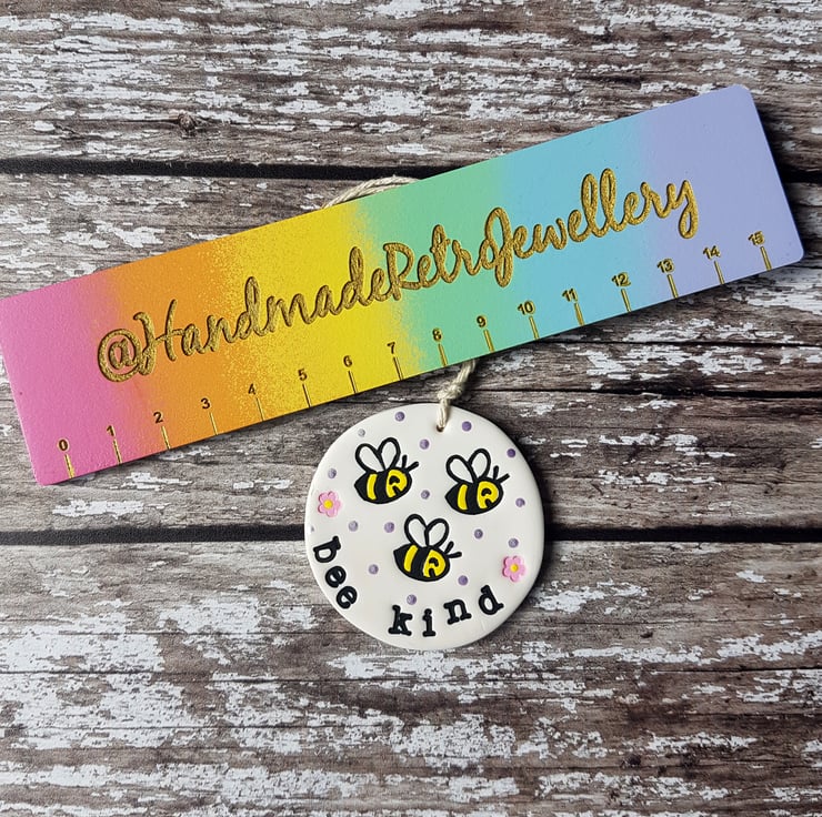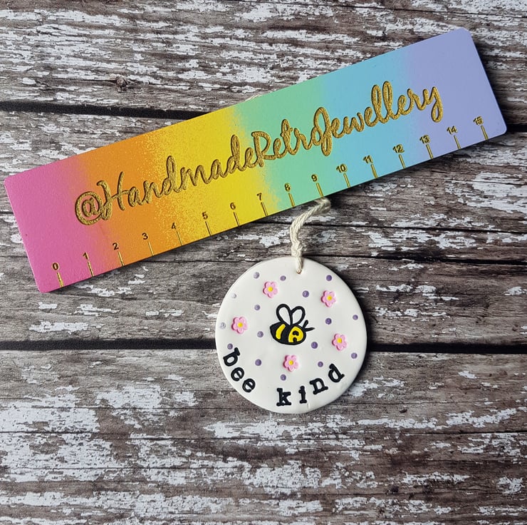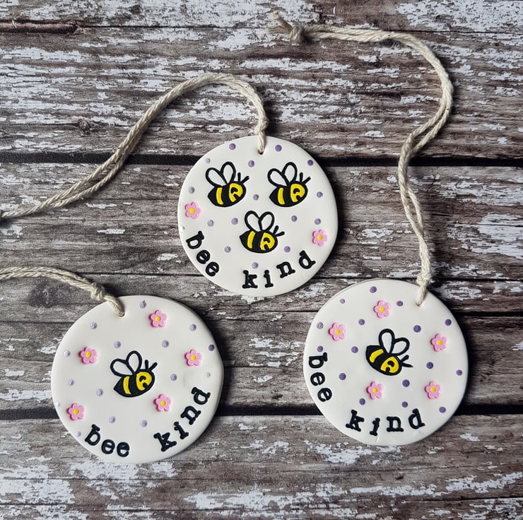 Each decoration is made of polymer clay, with a hand stamped design of a cute bee in the centre, little flowers and spots surrounding it, and either the phrase "Bee Kind" or "Bee Happy" individually stamped around the edge. The design has then been painted with acrylic paint to add colour and definition.