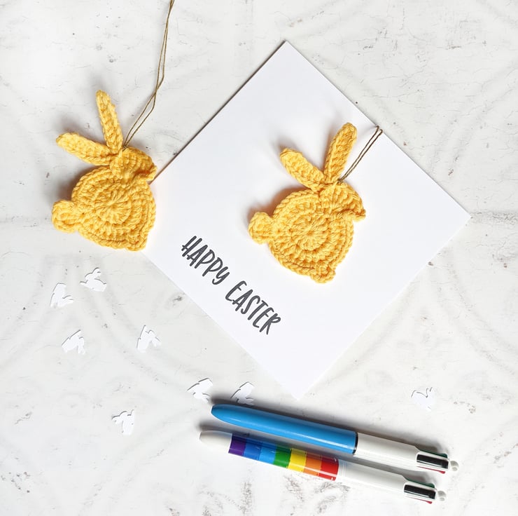 The greeting card is white card (6 inches x 6 inches) stamped with 'Happy Easter', the decoration is attached with washi tape on the inside so easily removed, left blank inside for your own message.