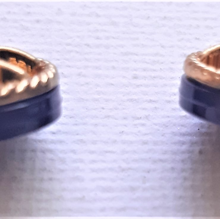 A pack of 2 x navy blue and gold buttons, 15mm in diameter, with a gold roped edge and buckle design across the centre, gold shank on the reverse.
