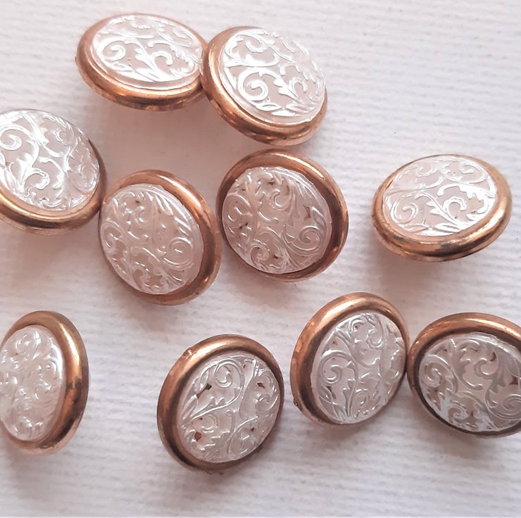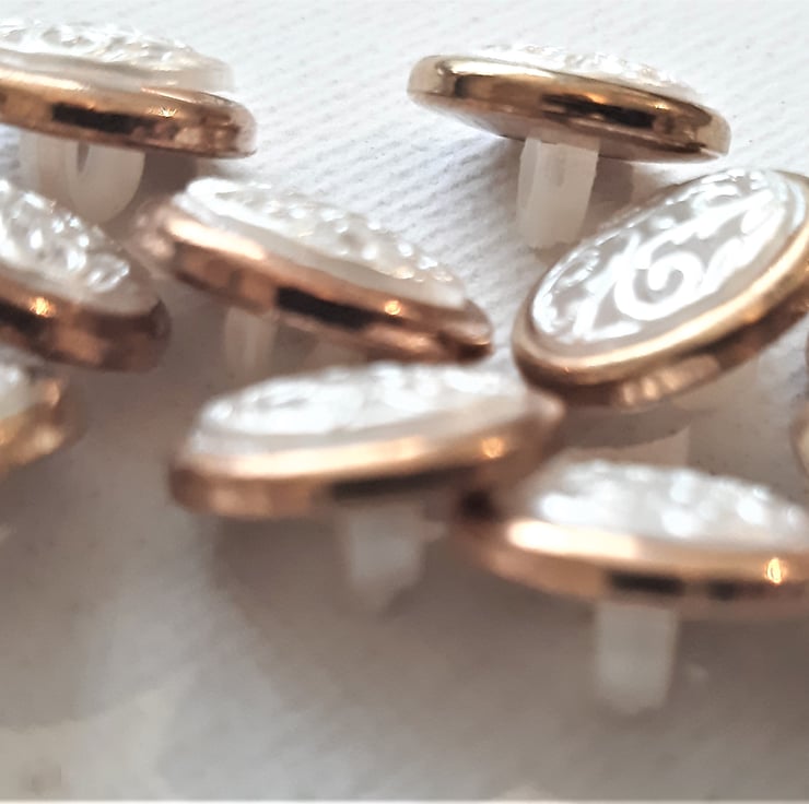 A pack of 10 buttons, 13mm in diameter, in a pearlescent white colour with a gold edge. These are so pretty with the intricate filigree pattern! The gold on the back can look a little bit tarnished, but they look fine from the front.