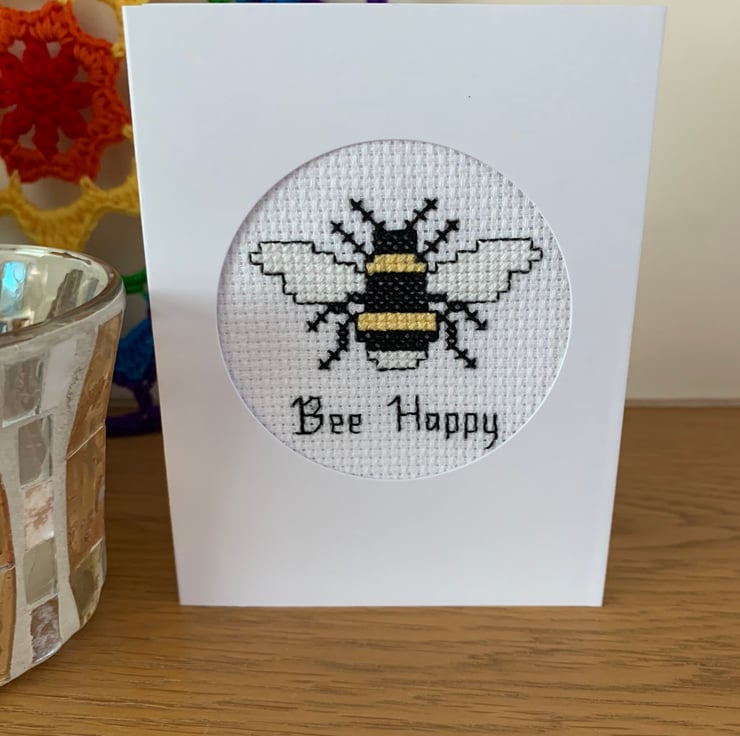 The front of the card also has Bee Happy stitched on the front. The card would be suitable for any occasion, because it is blank inside.