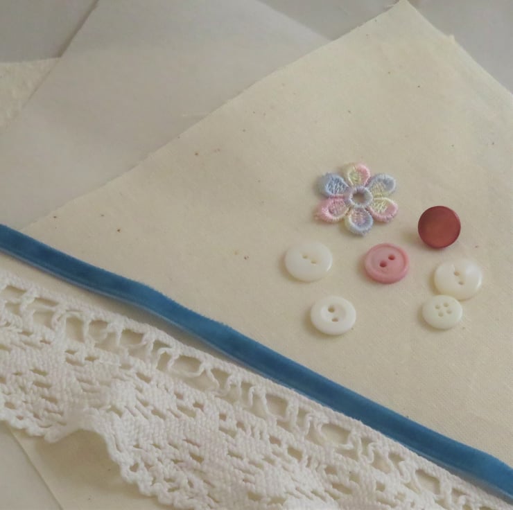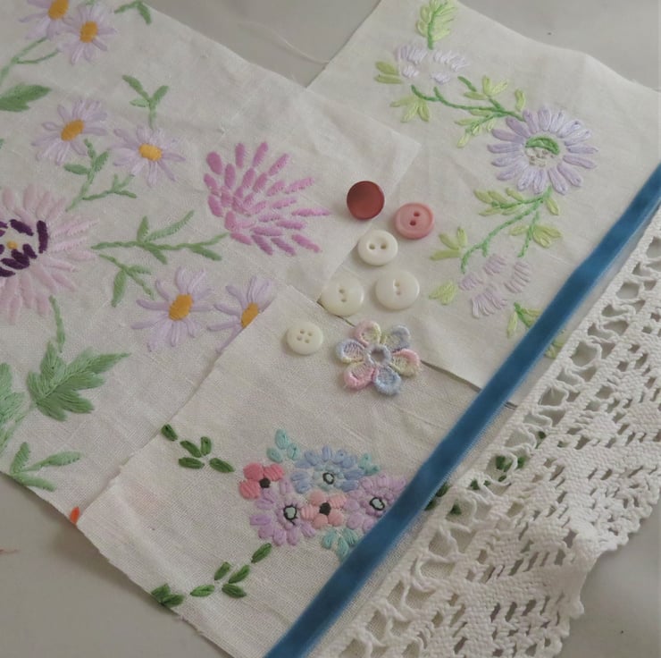 The vintage linens, and other fabrics, used have been carefully chosen, laundered and pressed to offer you a pleasing, coordinating selection ready for you to create an item of your choice.