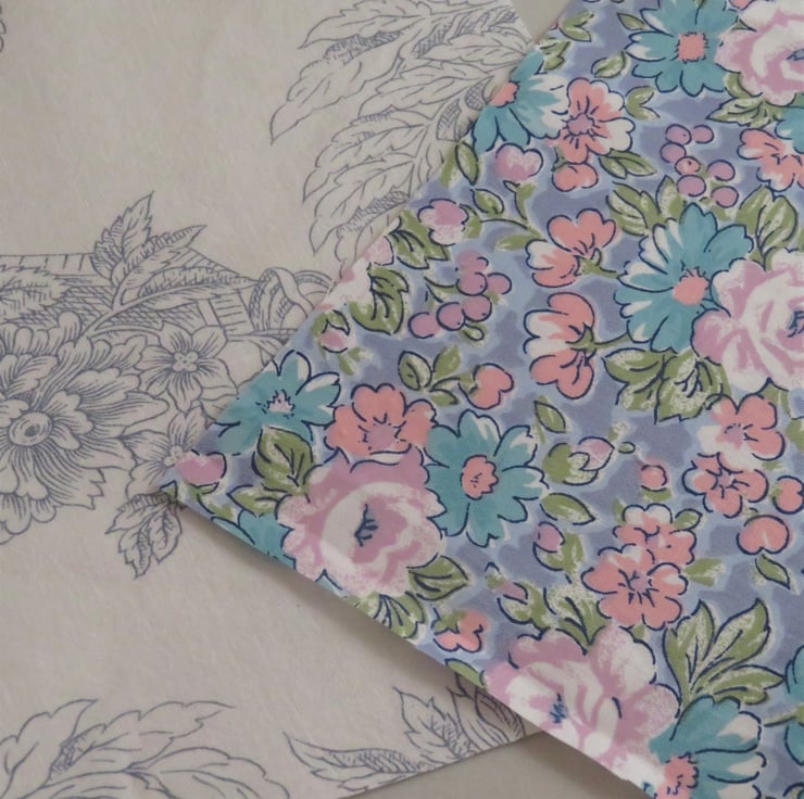 Squares 19 cm by 19 cm approx - sew in interfacing, calico, vintage turquoise and pink print (unused vinatge dress fabric), vintage - unbleached,unused flannelette sheeting, vintage - cotton, blue on white French sheeting