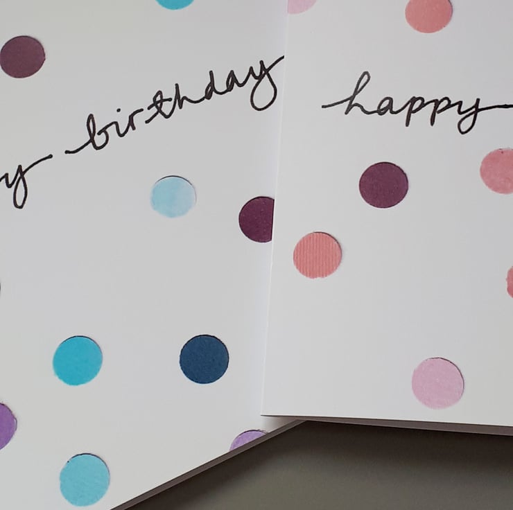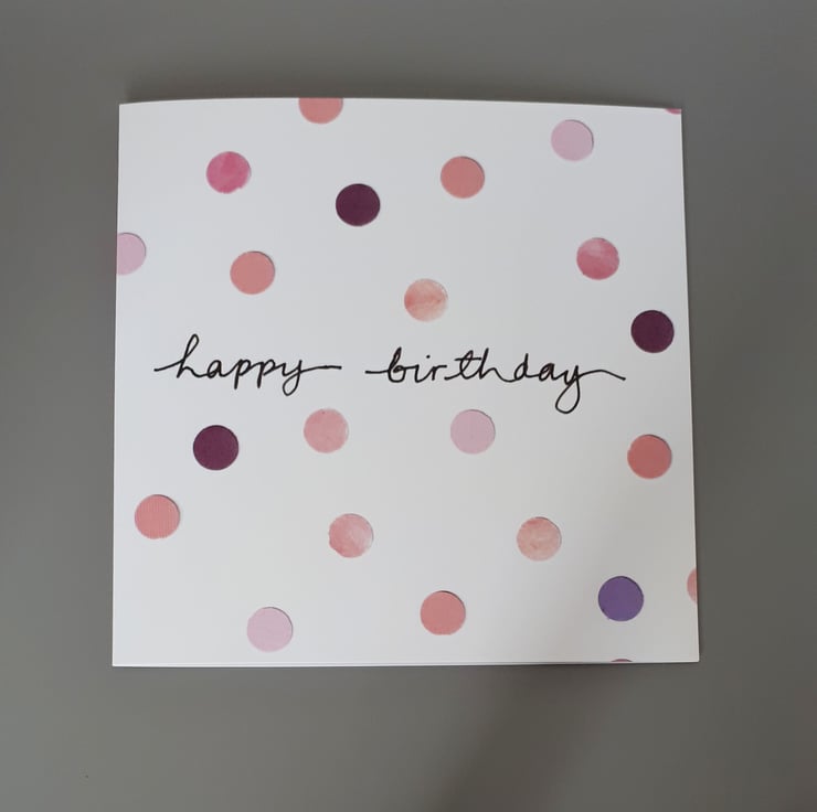 This birthday card has a background of pink, peach and blush circles and hand-lettered black text simply saying 'happy birthday'. The background circles were cut from handpainted and coloured papers. The original design was then reproduced digitally.