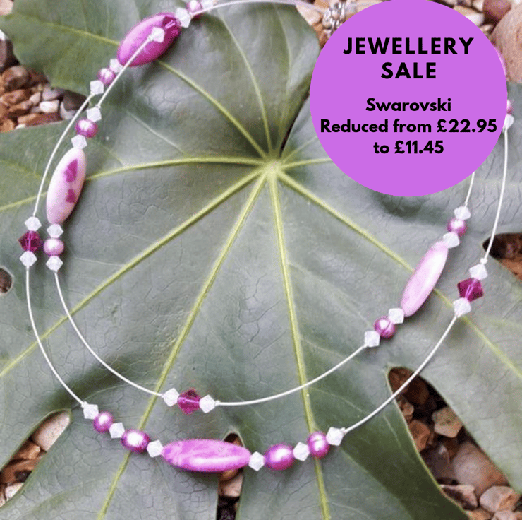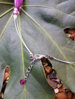 Measurements:- The longest strand is 18 inches and the shortest 16 inches with a 2 inch extender, at the back, so that you can lengthen the necklace accordingly. A pretty fuschia swarovski crystal, decorates the extender chain. Lobster clasp fastening that is easy to use.