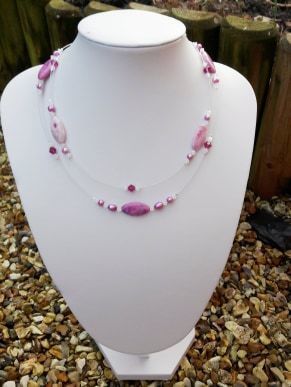 Multi strand handmade Pink Floating necklace with oblong fuschia pink agate beads, pink freshwater pearls and opal and fuschia pink swarovski crystals.