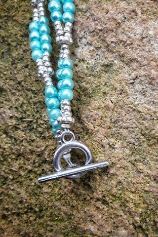 The necklace has been strung on a beading wire, with a double row of beads either side of the pendant. This piece has a“T bar” fastening which is comfortable to wear and easy to put on and take off.