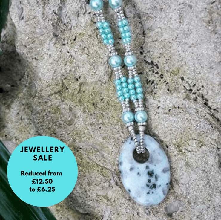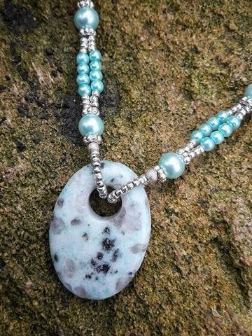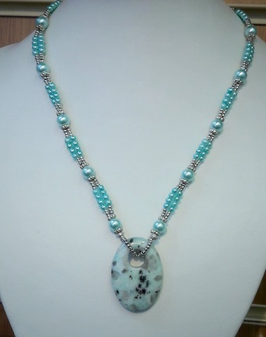 Handmade Glass Pearl Beaded Necklace with a Kiwi Jasper Stone centre piece. The glass Pearls are sea green, sprinkled with little silver daisy spacer beads and seed beads in between, which compliment this beautiful gemstone with green tones.