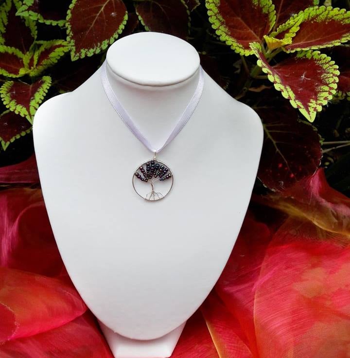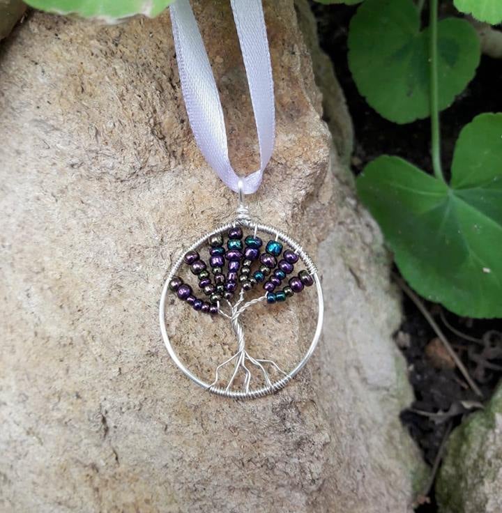This intricate handmade tree of life sits on a lilac satin ribbon with silver plated ribbon ends and lobster clasp fastening.