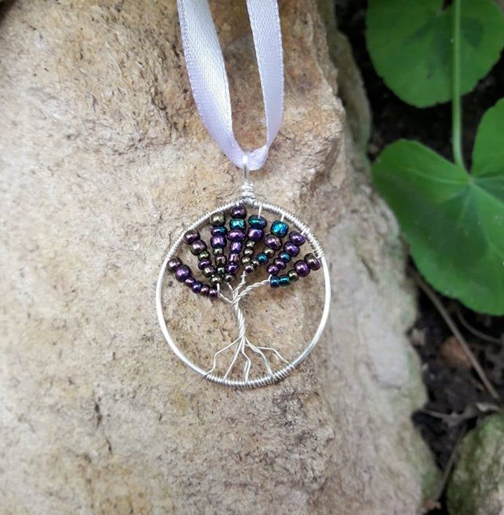Handmade Wirewrapped tree of life with Irridescent metallic purple blossom toned seed beads. The first stage of the process is to make the circle, using a thick wire that is shaped around a wooden mandrel. The wire is then cut, wrapped at the top and hammered to work harden the wire (using a nylon tipped hammer).
