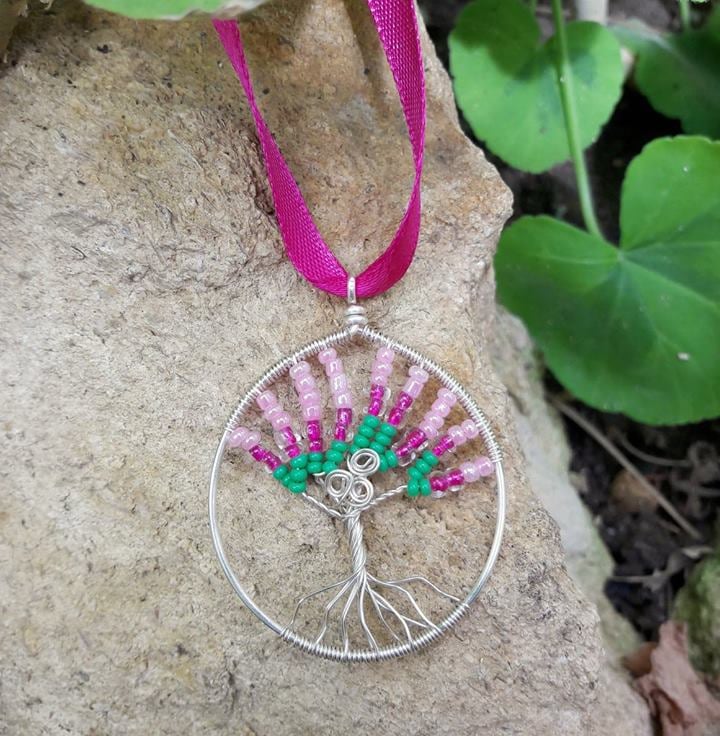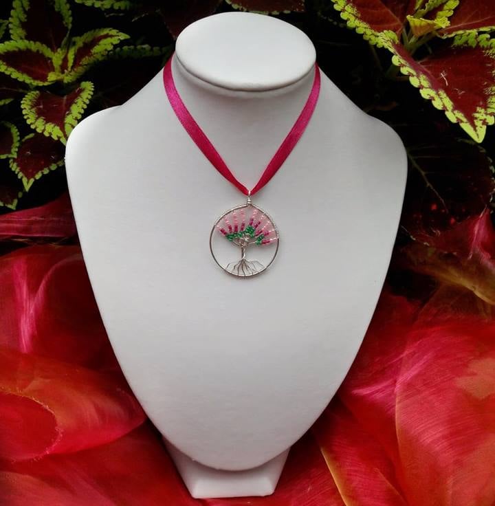 This intricate handmade tree of life sits on a hot pink satin ribbon with silver plated ribbon ends and lobster clasp fastening.