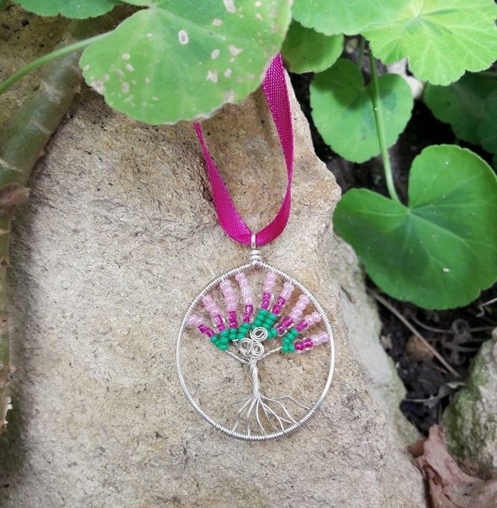 Handmade Wirewrapped tree of life with Cherry blossom toned seed beads comprising hot pink, soft pink and green. The first stage of the process is to make the circle, using a thick wire that is shaped around a wooden mandrel. The wire is then cut, wrapped at the top and hammered to work harden the wire (using a nylon tipped hammer).